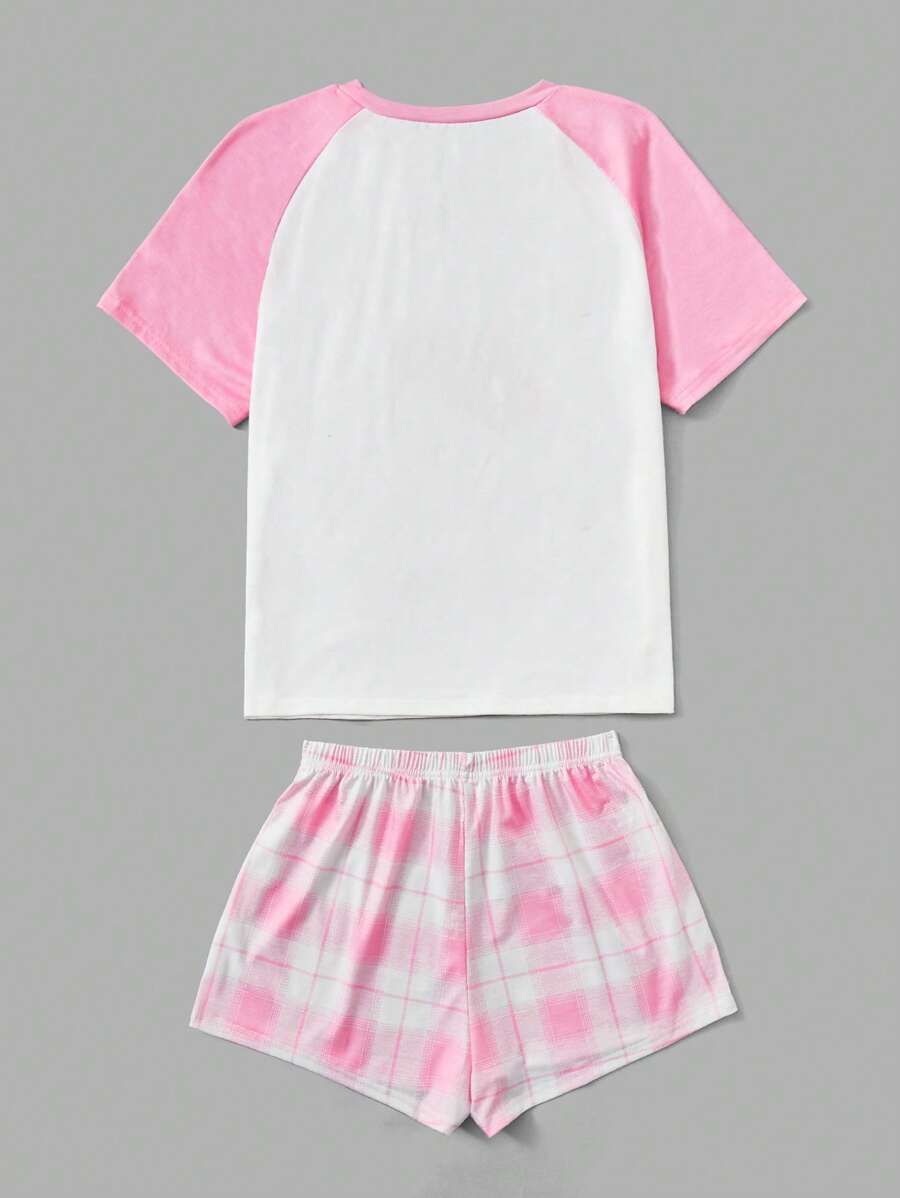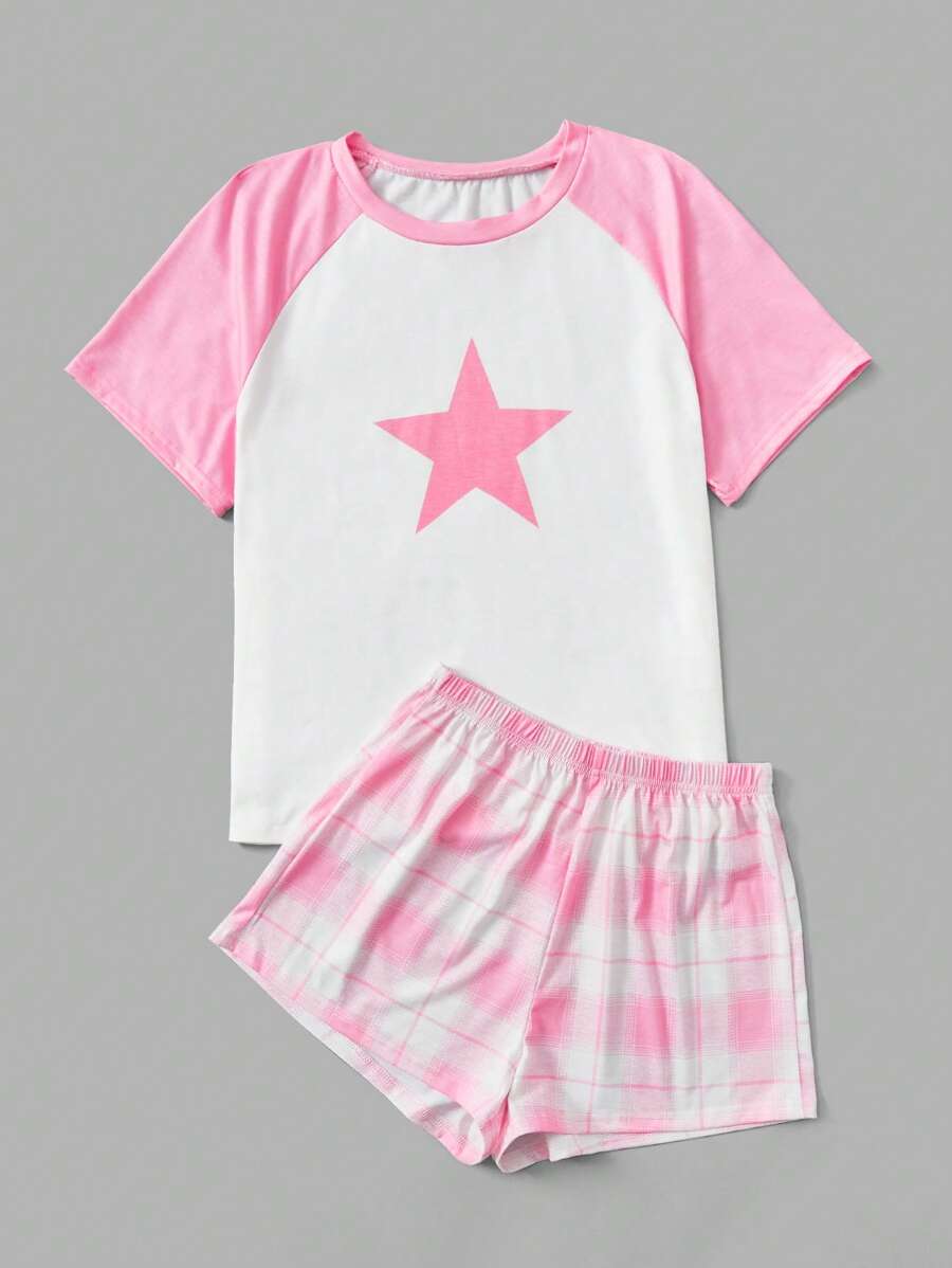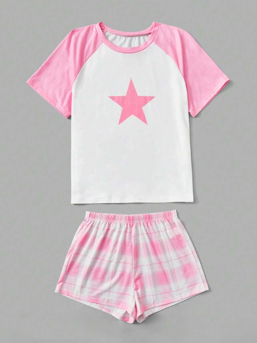 Grunge Punk Star Print Raglan Sleeve Tee & Plaid Shorts PJ Set