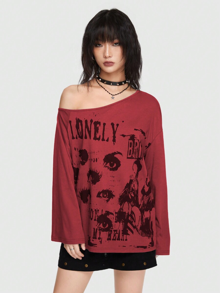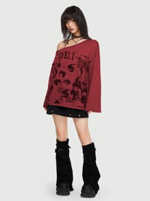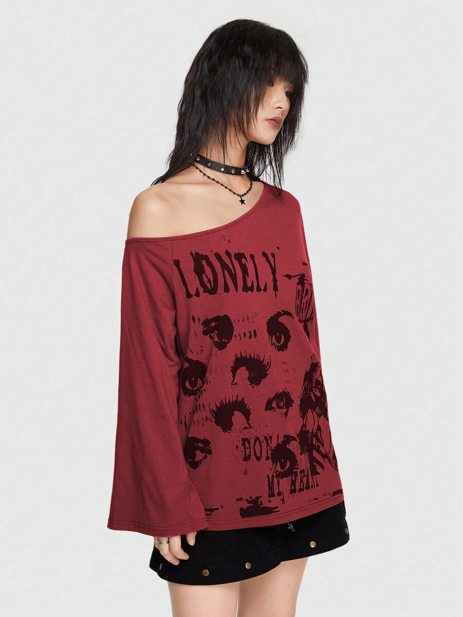 Grunge Punk Streetwear Punk Style Printed Loose T-Shirt With Asymmetrical Neckline And Flare Sleeves