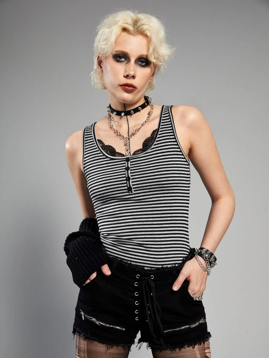 Grunge Punk Striped Lace Trim Tank Top