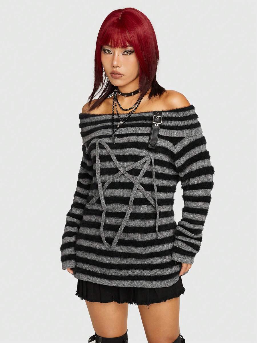 Grunge Punk Striped Star Pattern Off Shoulder Sweater