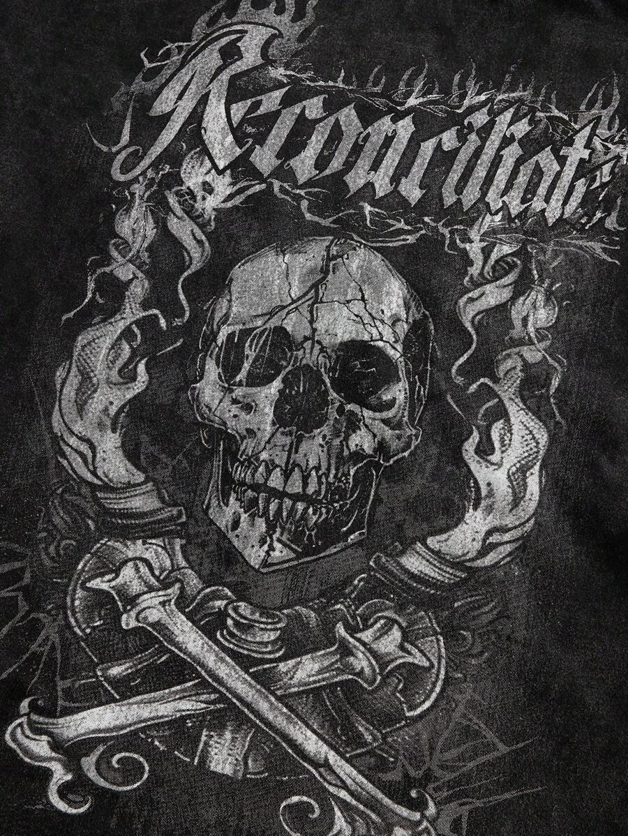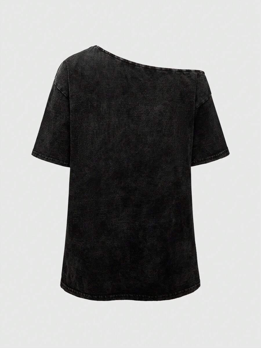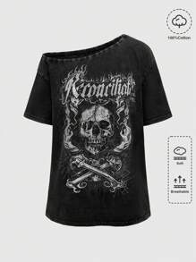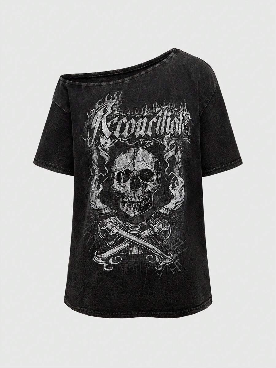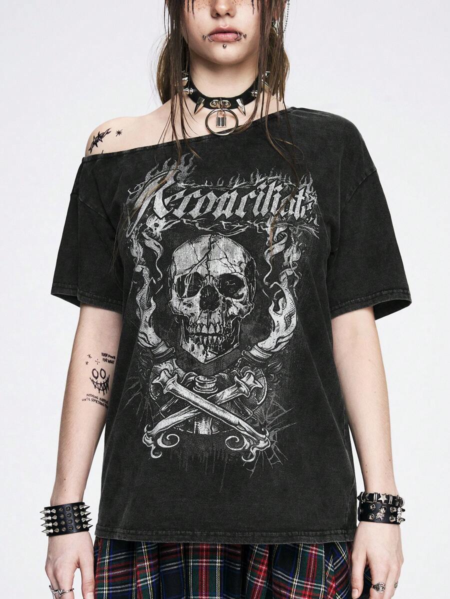 Grunge Punk Subculture Punk Loose Skull Print Acid-Washed Distressed Slouchy Asymmetrical Neck Women's T-Shirt, School