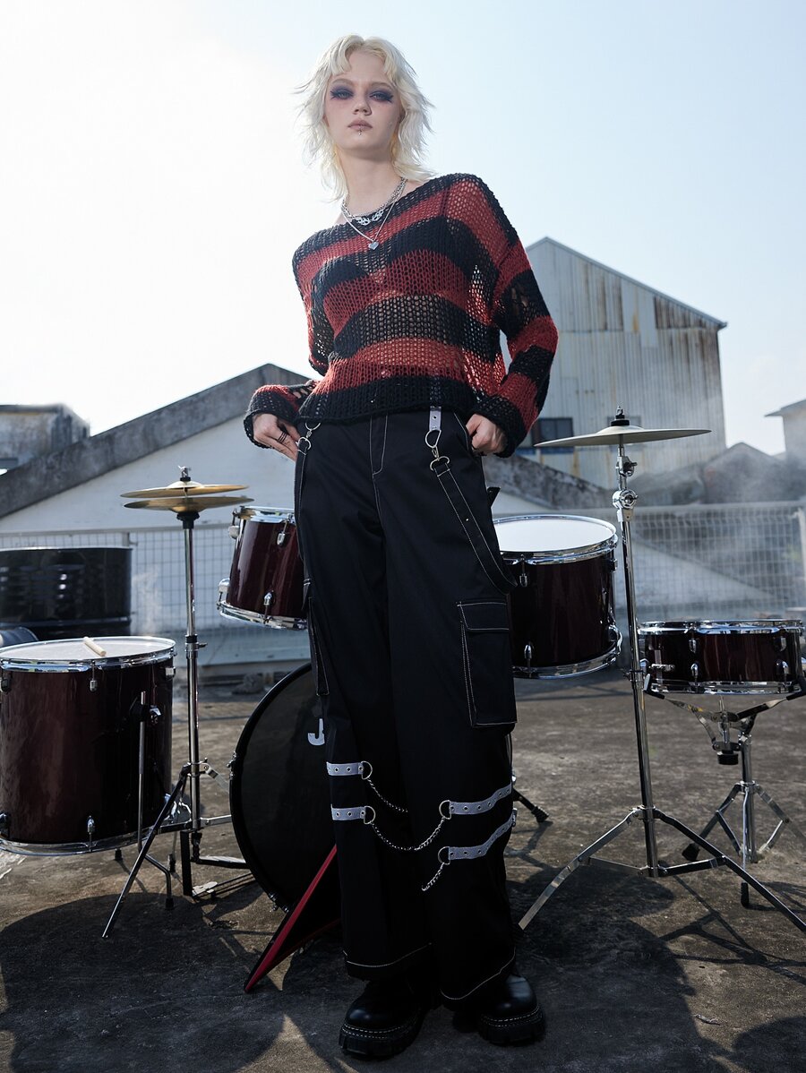 Grunge Punk Summer Crochet Striped Pattern Drop Shoulder Sweater, School