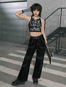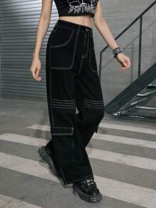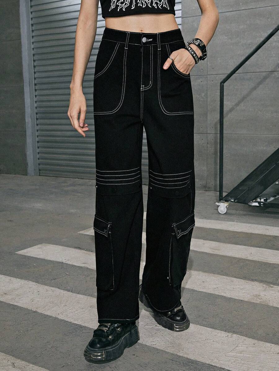 Grunge Punk Top-stitching Flap Pocket Cargo Jeans