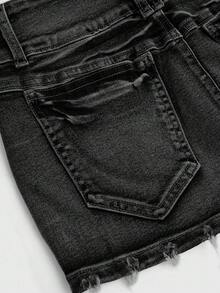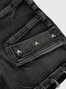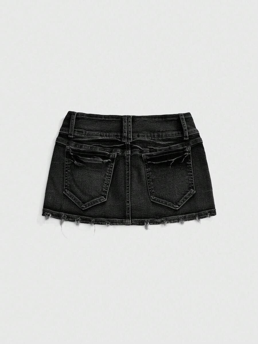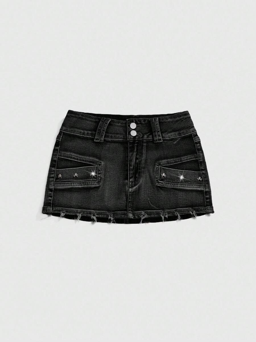 Grunge Punk Spring/Summer Casual Black Vintage Distressed Skull Studded Low Waist Sexy Denim Mini Skirt For Women