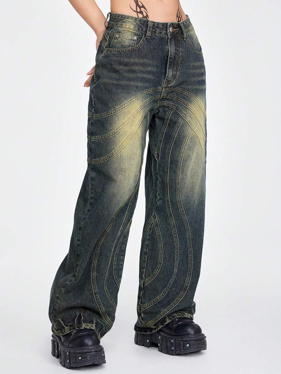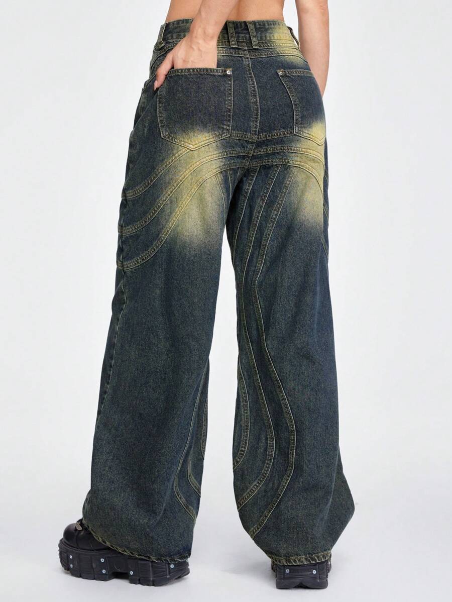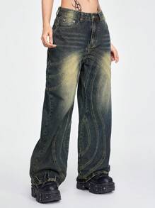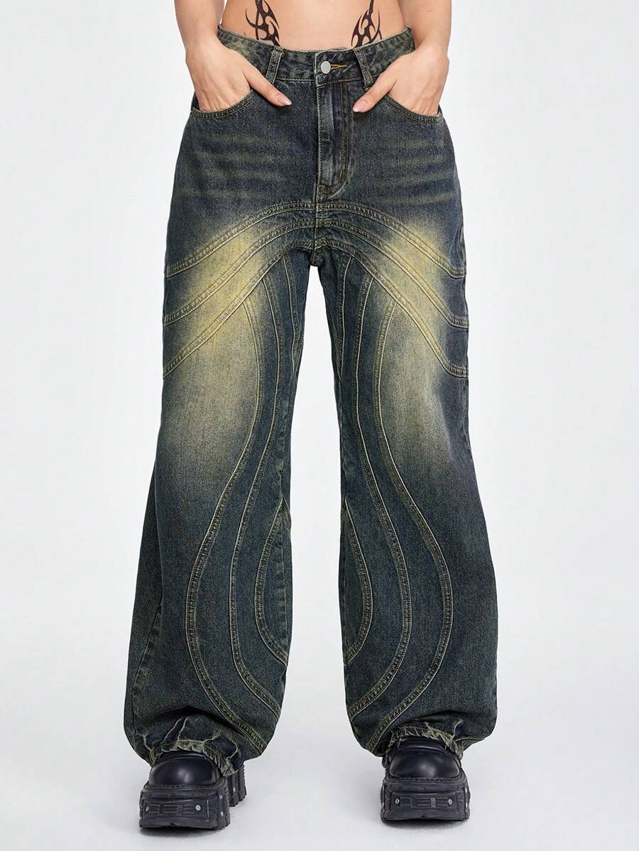 Grunge Punk Vintage Loose Street-Style Distressed Splicing Stripe Details Washed Jeans For Women