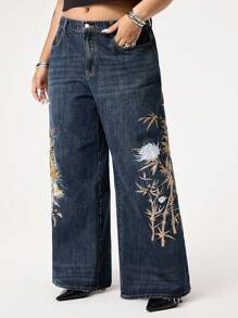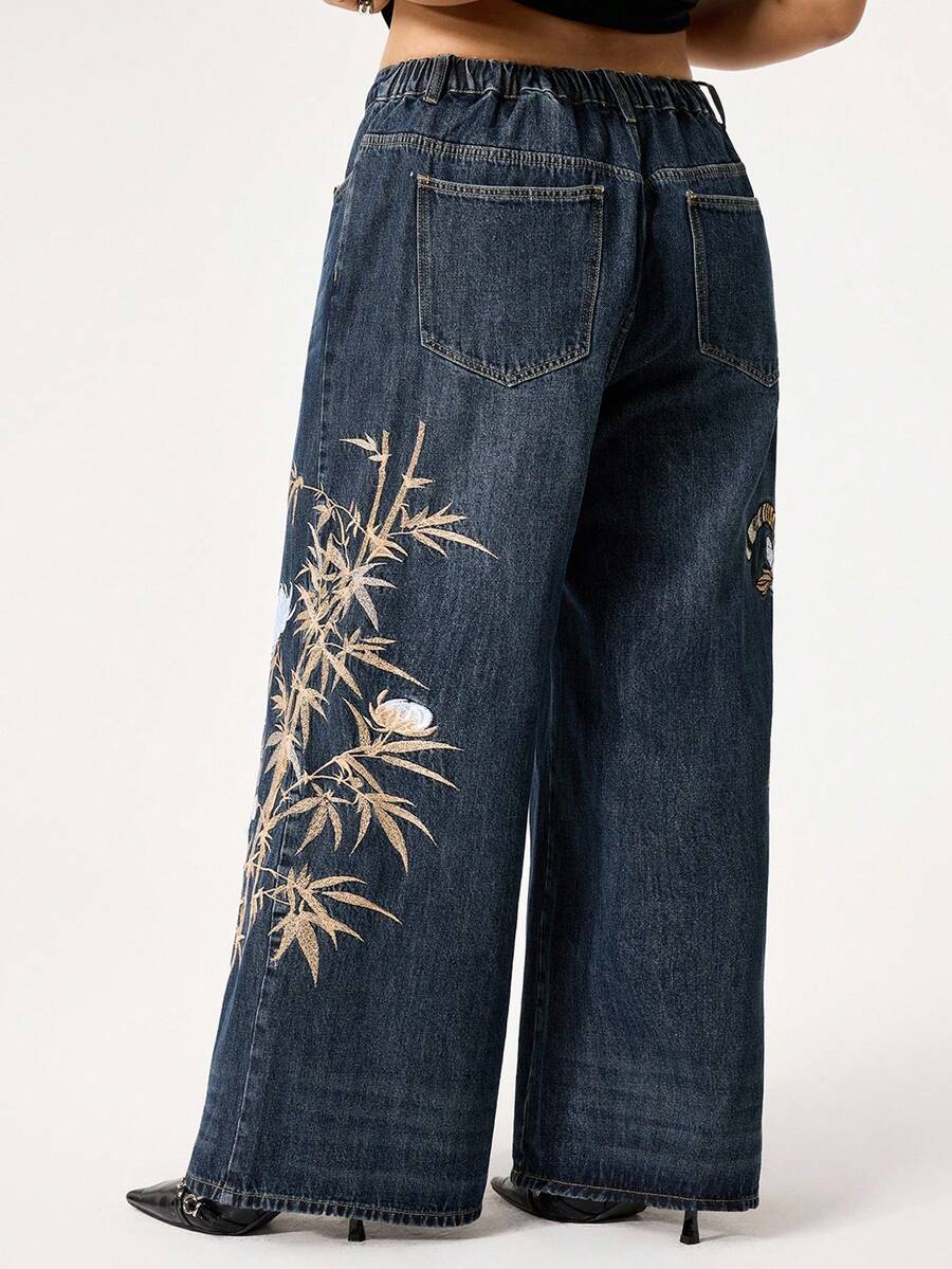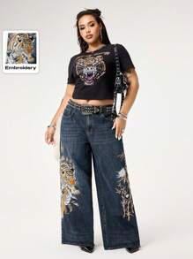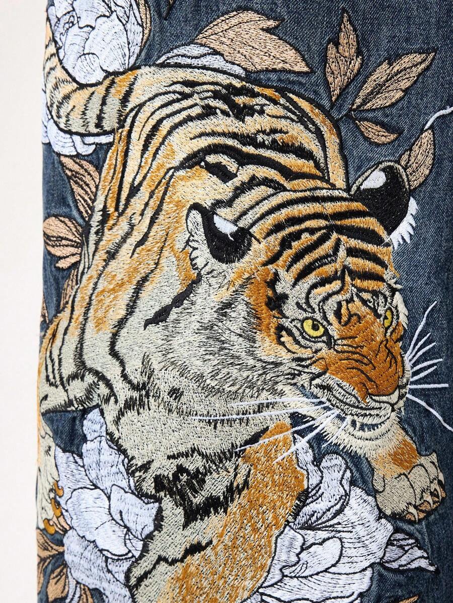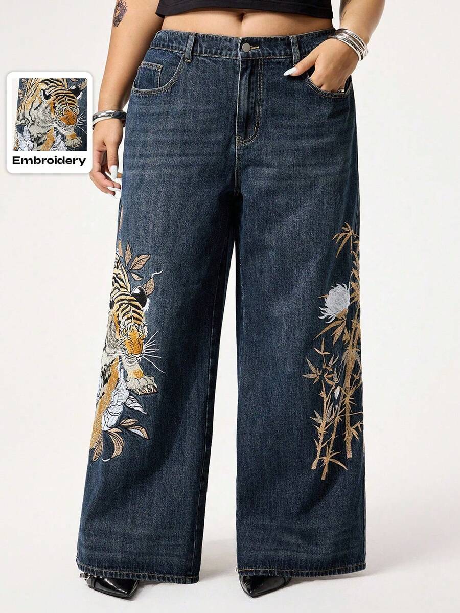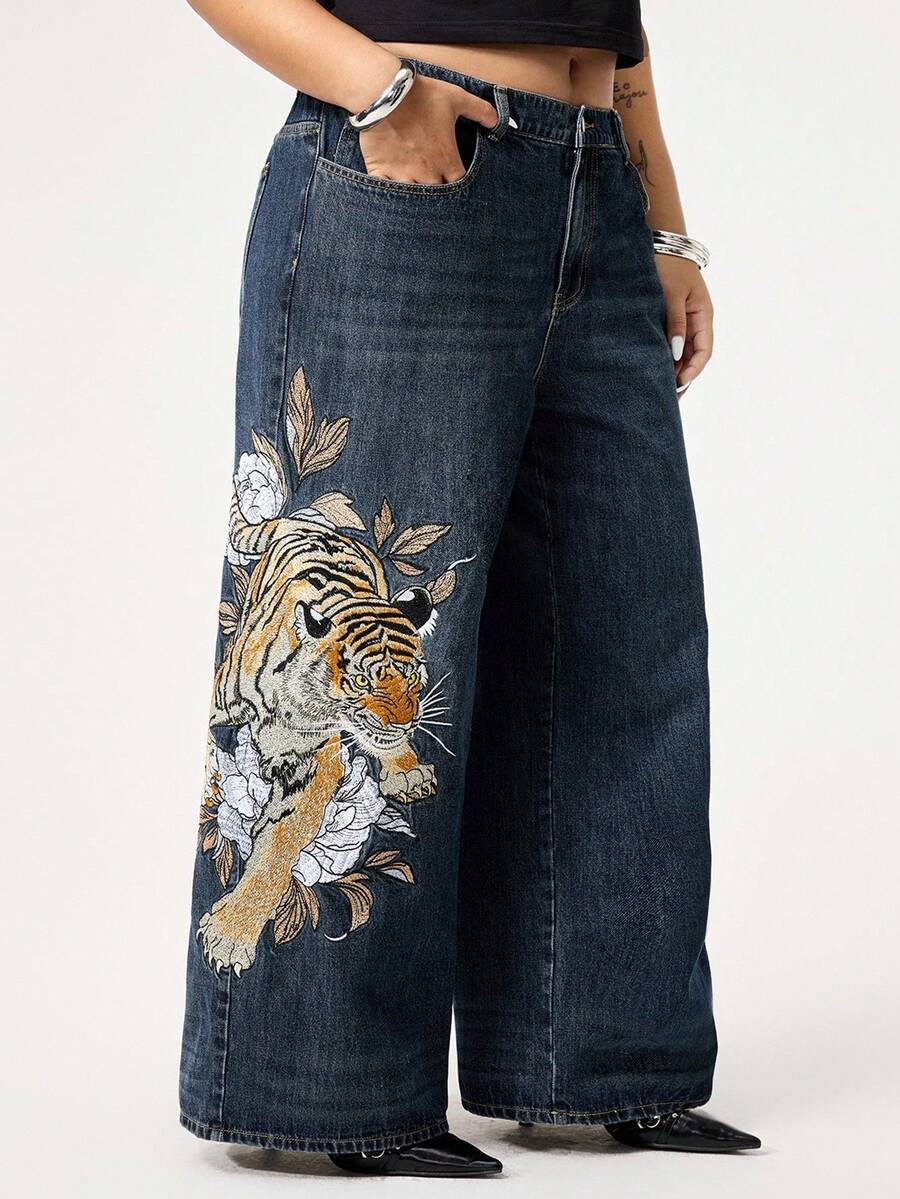 Grunge Punk Vintage Street-Style Chinese Tiger & Floral Embroidered Loose Wide-Leg Plus Size Unisex Jeans