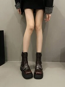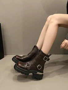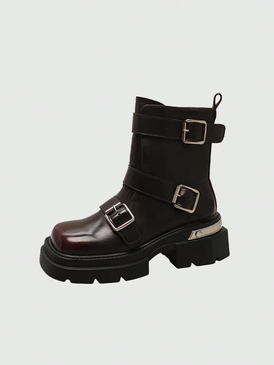Grunge Punk Women Buckle Decor Chunky Heeled Boots, Preppy Outdoor Fashion Boots