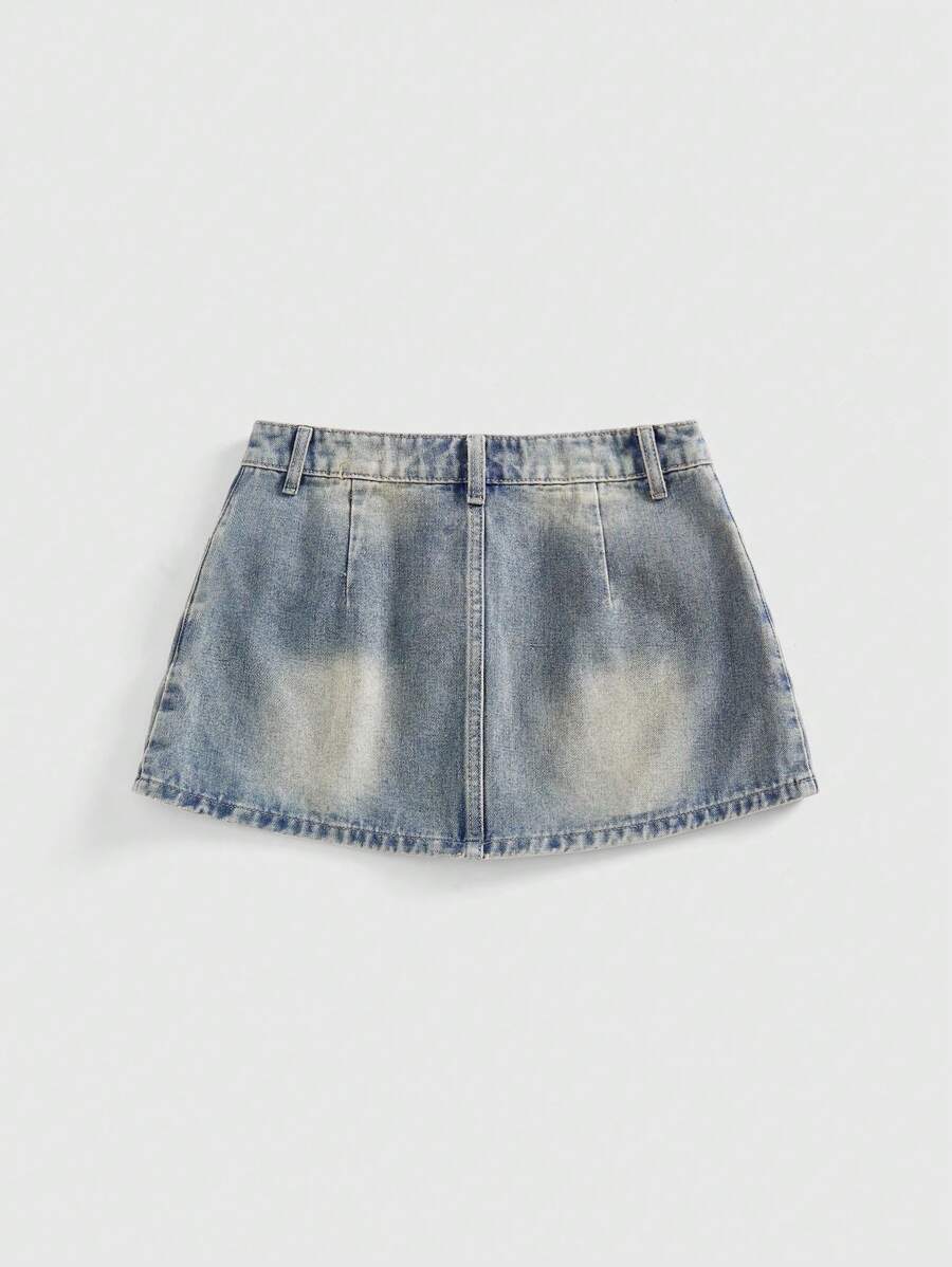 Grunge Punk Women Leopard Patch Embroidered Cross Detail Denim Mid-Length Skirt