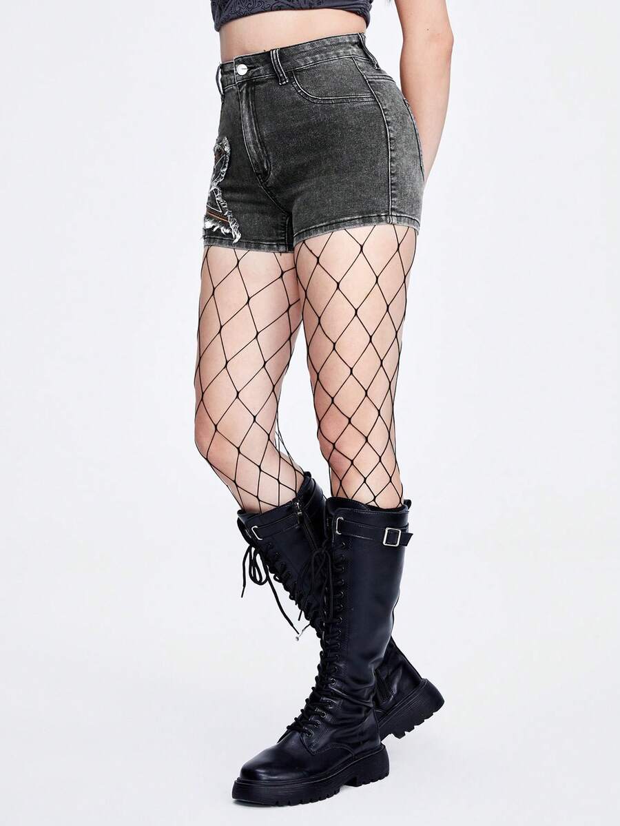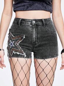 Grunge Punk Women'S Denim Shorts With Star Shaped Patch