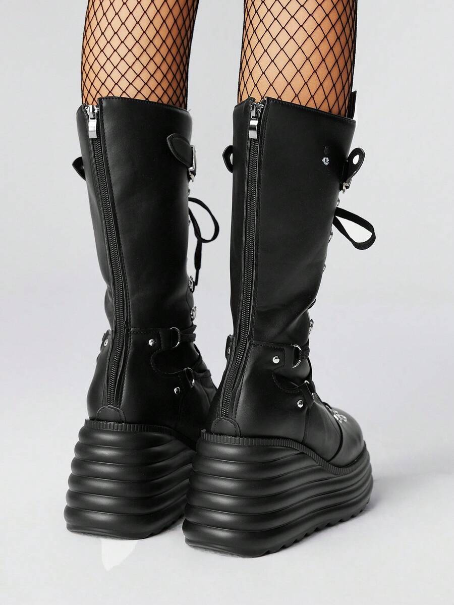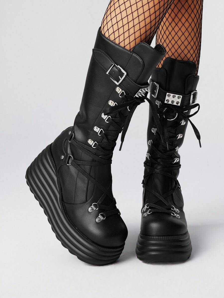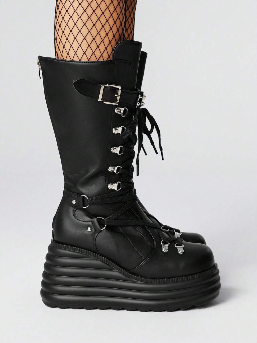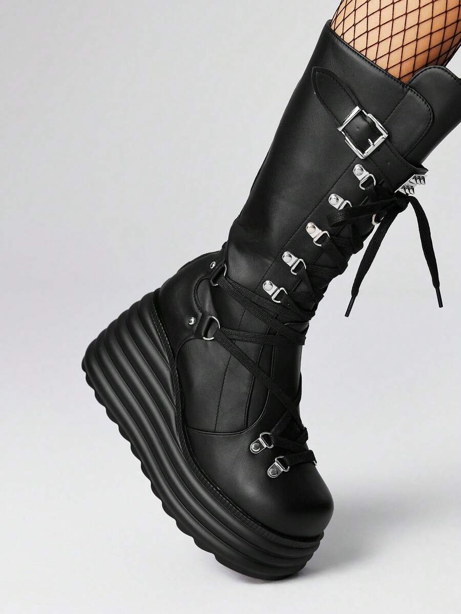 Grunge Punk Women's 2025 Autumn/Winter New Style Outdoor Punk Dark Style Lace-Up Platform Thick Sole Mid-Calf Boots