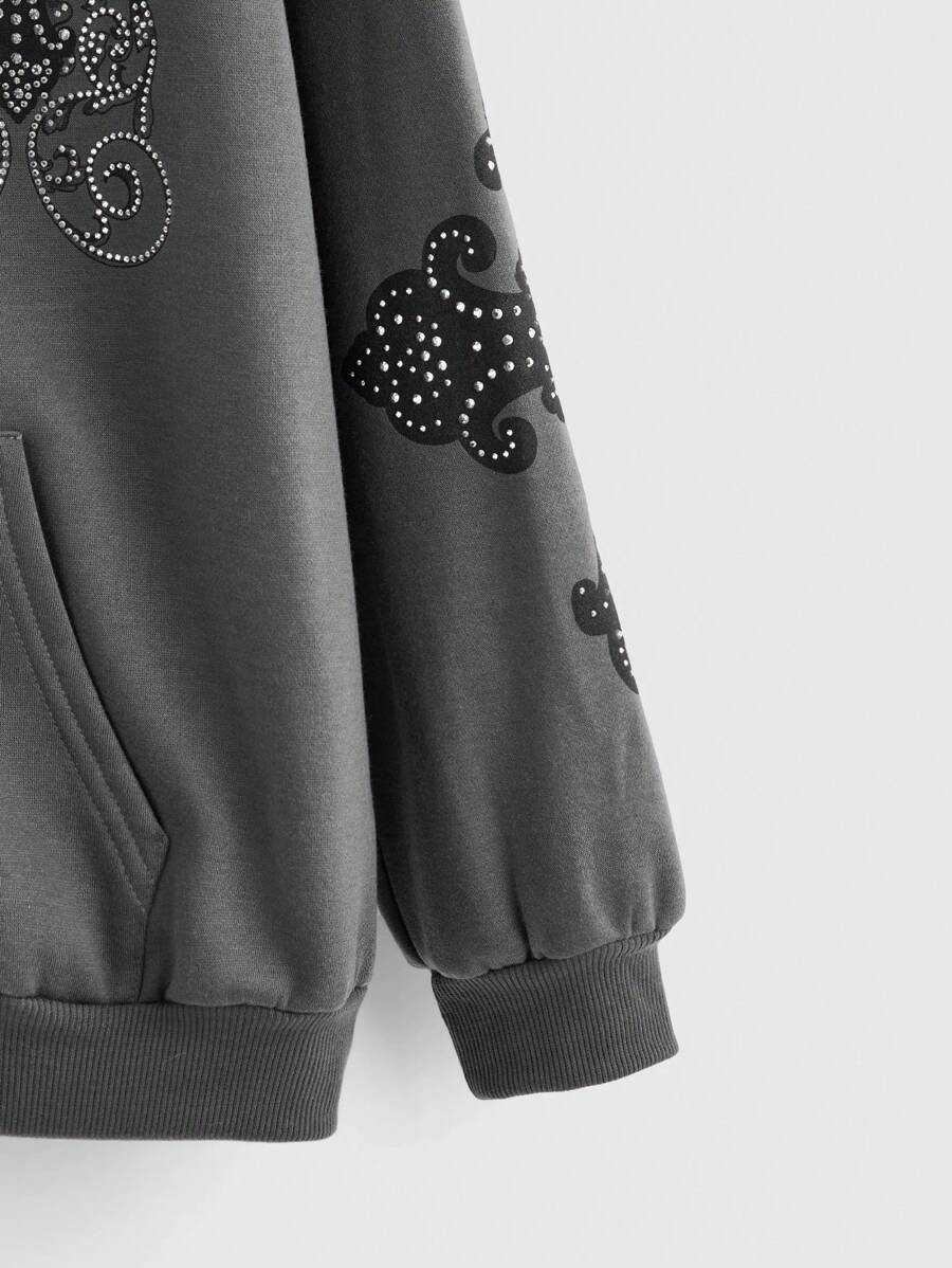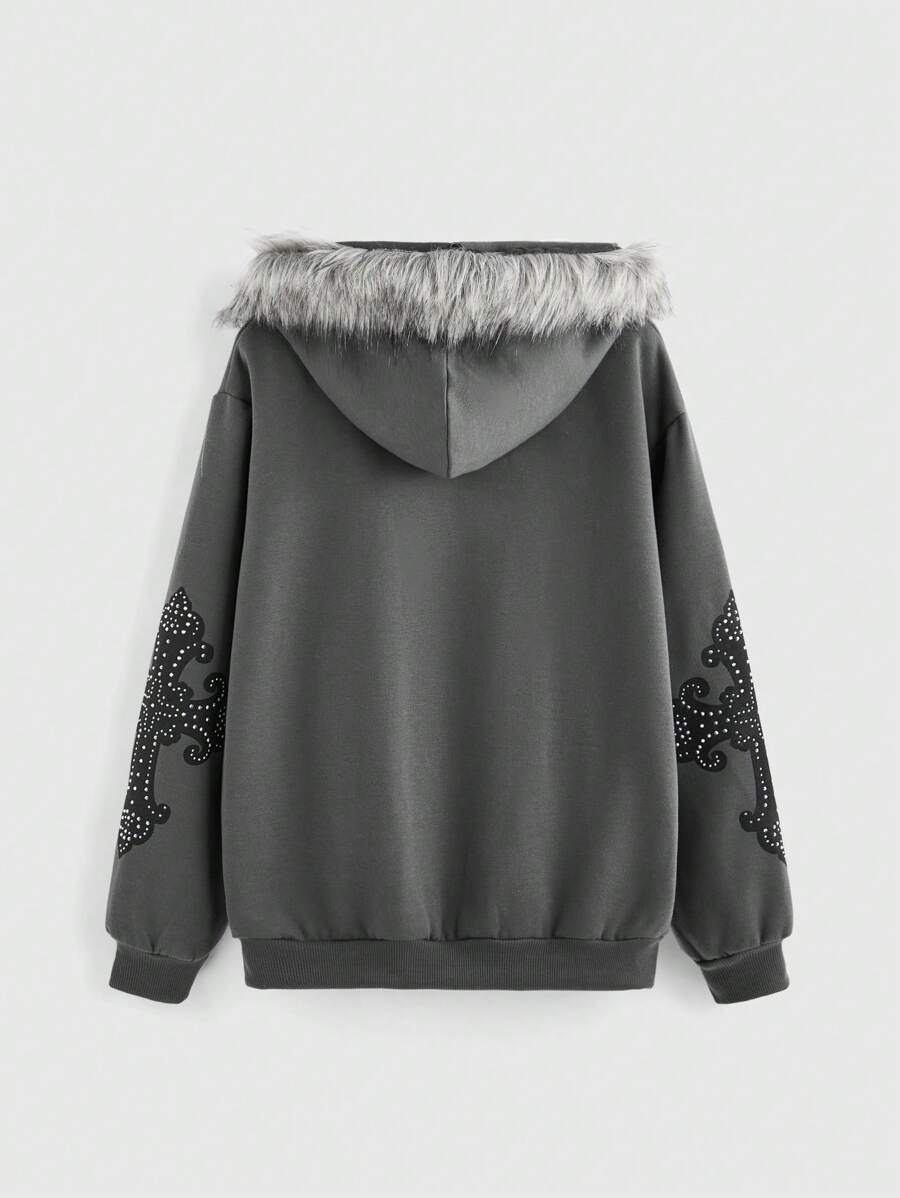 Grunge Punk Women's Autumn Patchwork Furry Cross Rhinestone Embellished Hooded Sweatshirt
