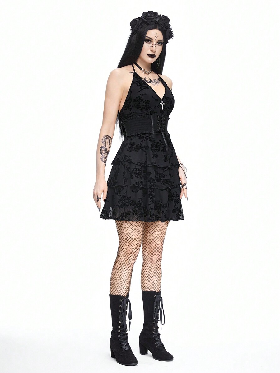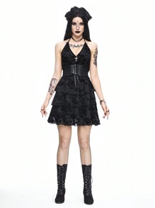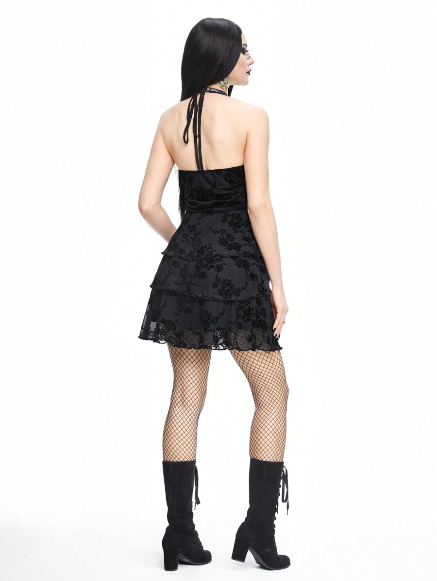 Grunge Punk Women's Black Flocked Cross Halter Neck Dress With Ruffle Hem