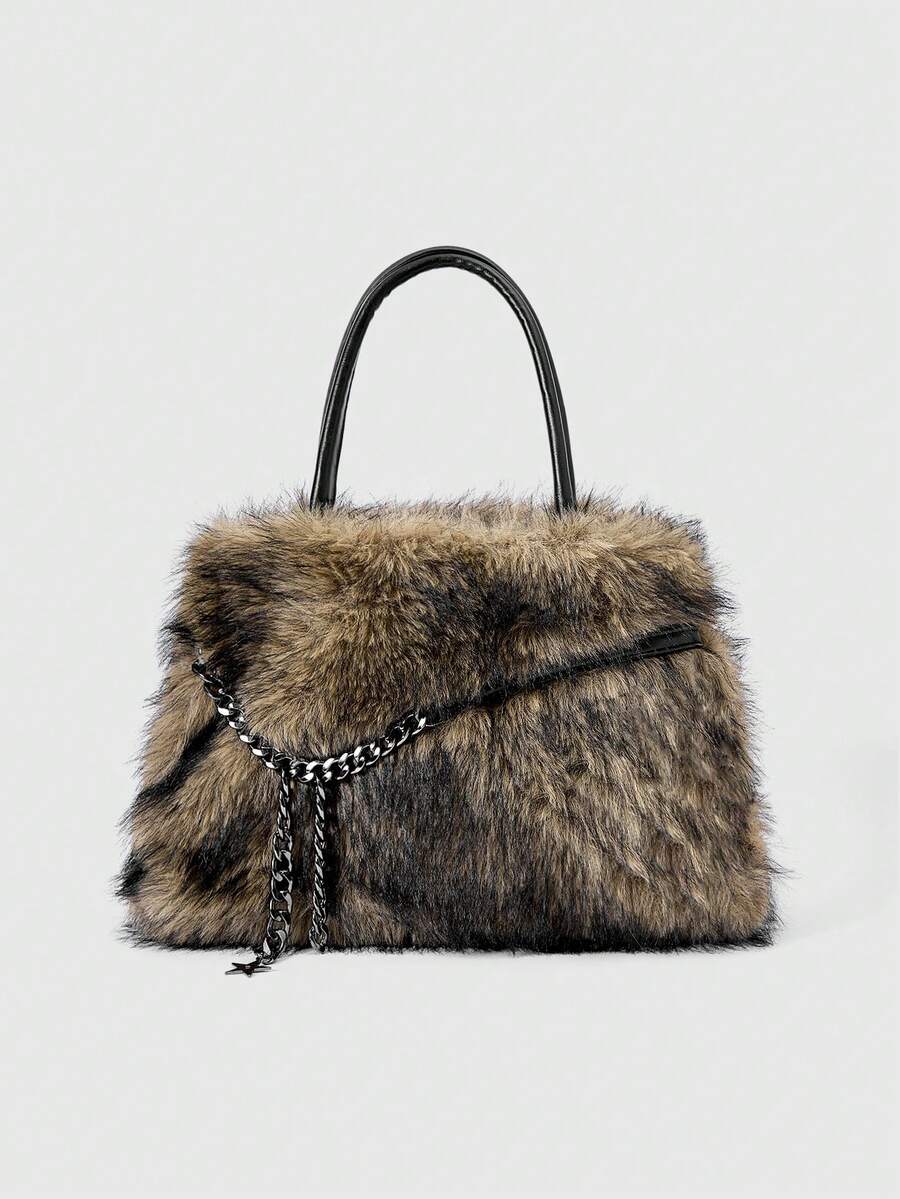 Grunge Punk Women's Chain Decor Plush Fashionable Versatile Handbag