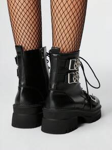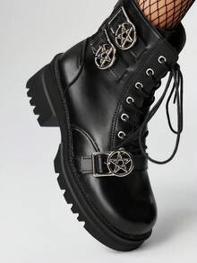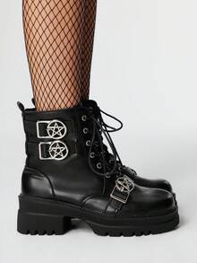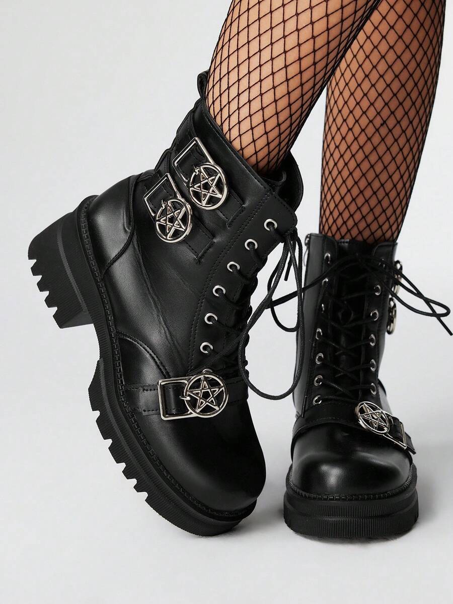 Grunge Punk Women's Dark Gothic/Punk Lace-Up Star Decor Platform Thick Heel Ankle Boots, Y2K Party Dress Boots With Belt Buckle, 2025 Knight Boots Suitable For All Seasons, Halloween