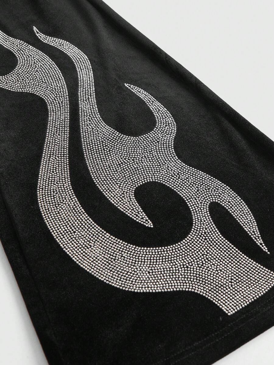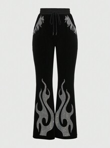 Grunge Punk Women's Flared Pants With Flame Print And Rhinestone Detailing