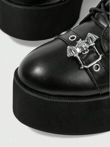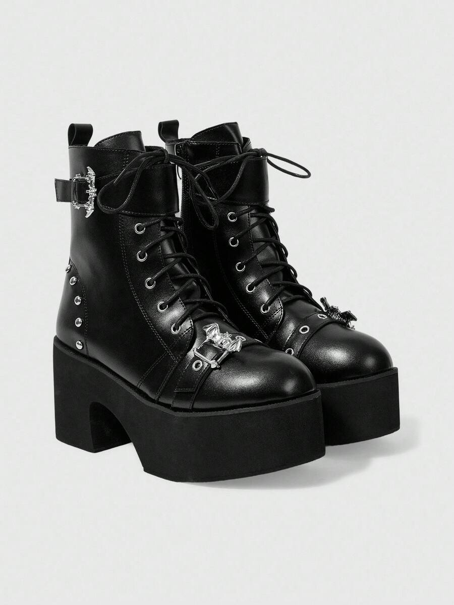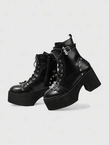 Grunge Punk Women's Gothic Metal Buckle Round Toe Chunky Heel Punk Boots, PU Black High Heel Boots Suitable For Party, Daily Wear, Evening Dress, Height Increasing And Leg Lengthening