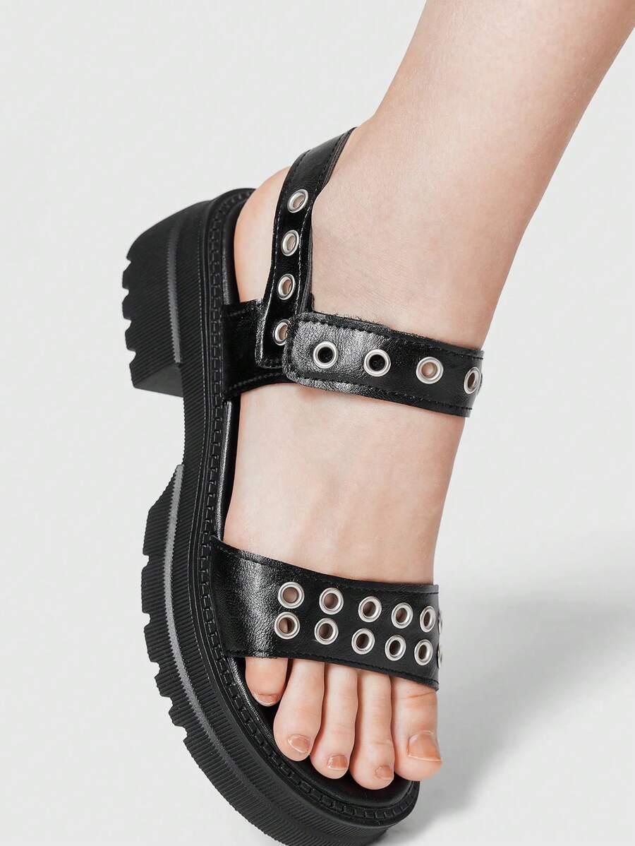 Grunge Punk Women's Gothic Punk Rock Style One Buckle Strap Perforated Rivet Sandals, Open Toe Roman Beach Summer Sandals, Soft Bottom Vacation Platform Wedge Heel Sandals Spring Shoes Spring Break Easter