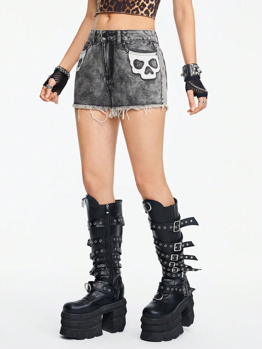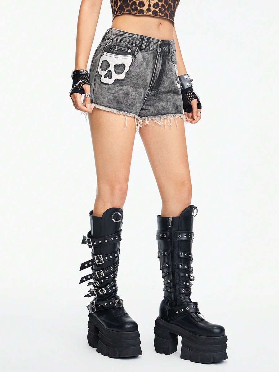 Grunge Punk Women's Gothic Skull Contrast Color Patch Embroidery Frayed Denim Shorts, Summer