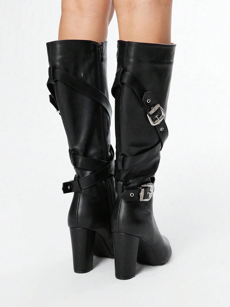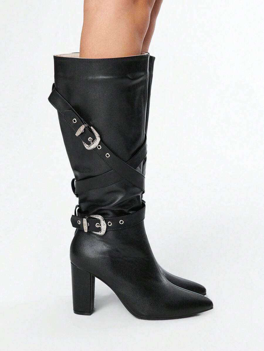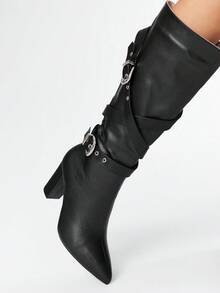 Grunge Punk Women's High Heel Boots, Versatile Elegant Pointed Toe Fashion PU Thick Heel Boots, Autumn/Winter