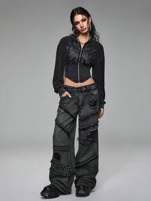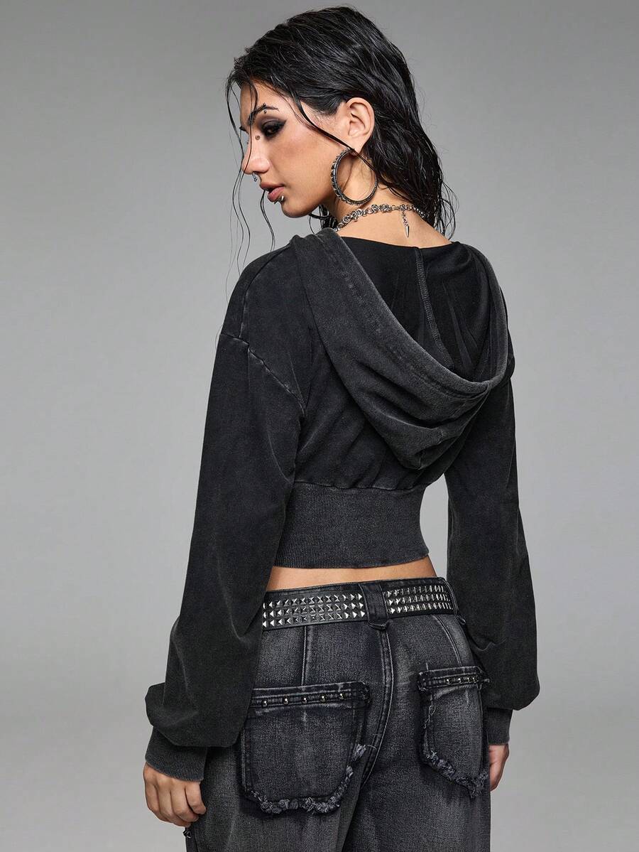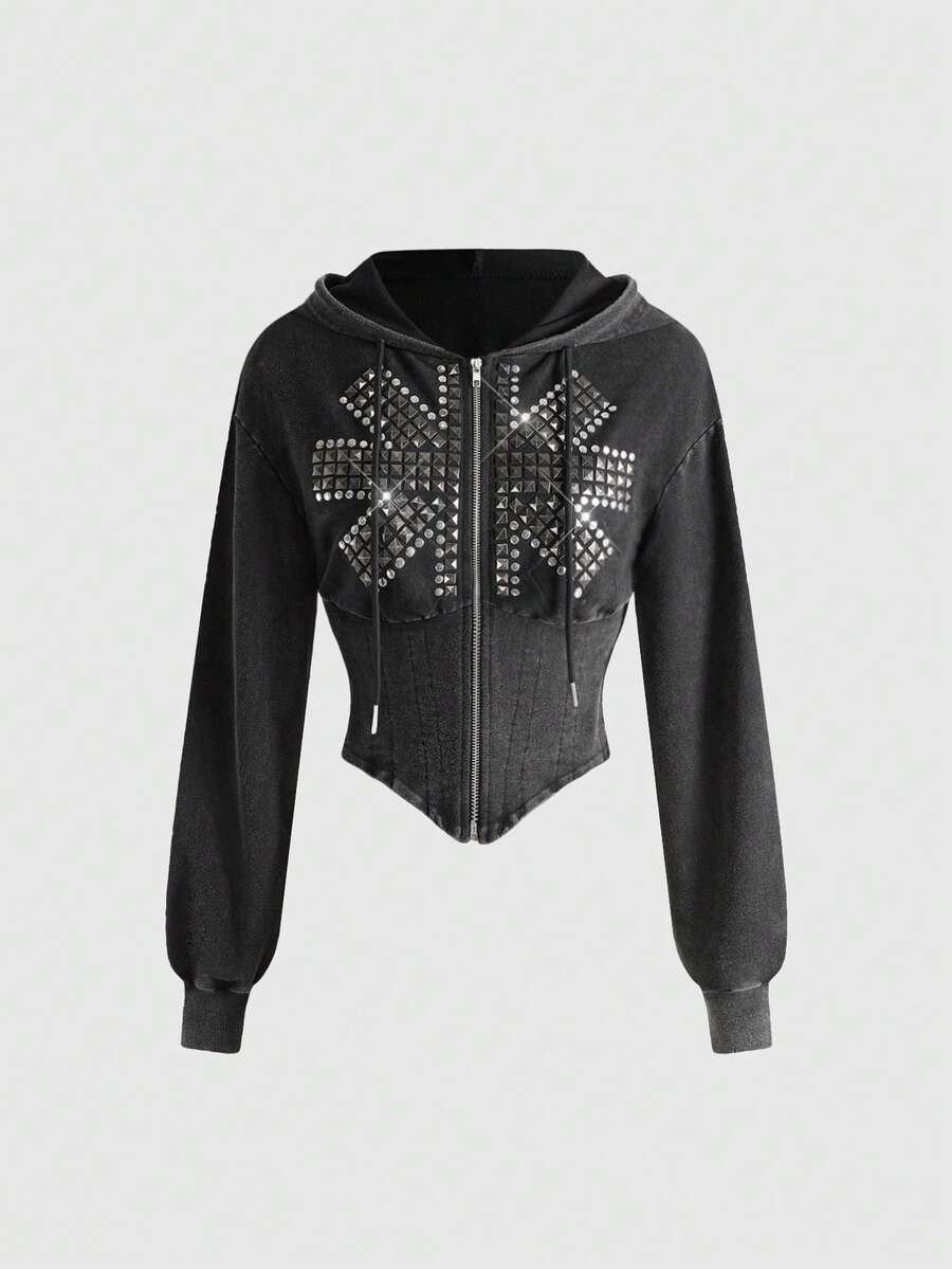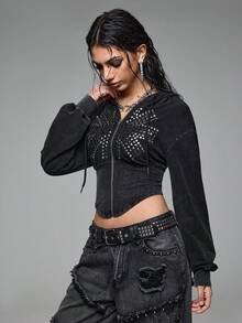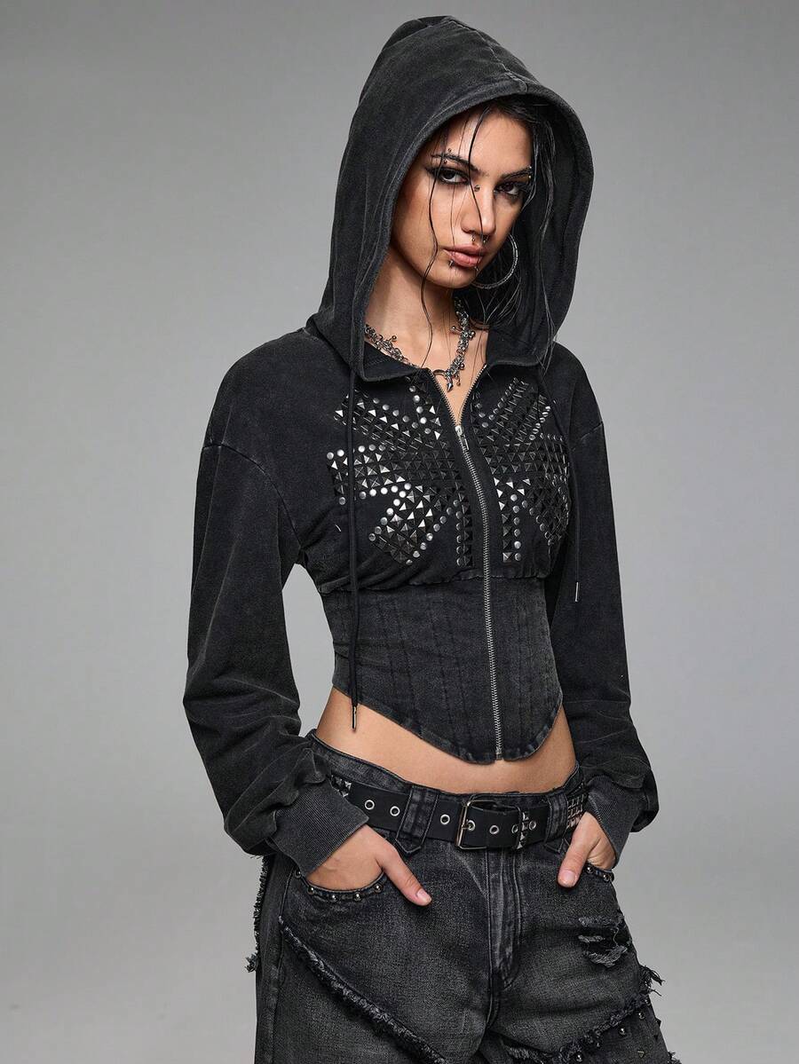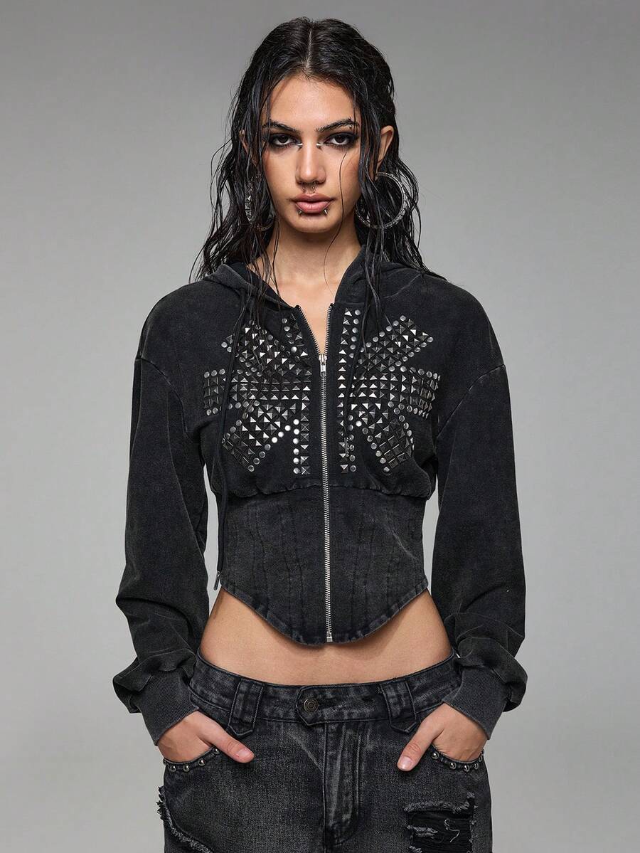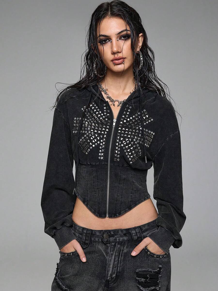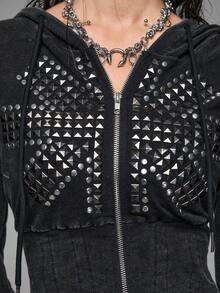 Grunge Punk Women's Kpop Punk Retro Union Jack Studded Cropped Hoodie Sweatshirt