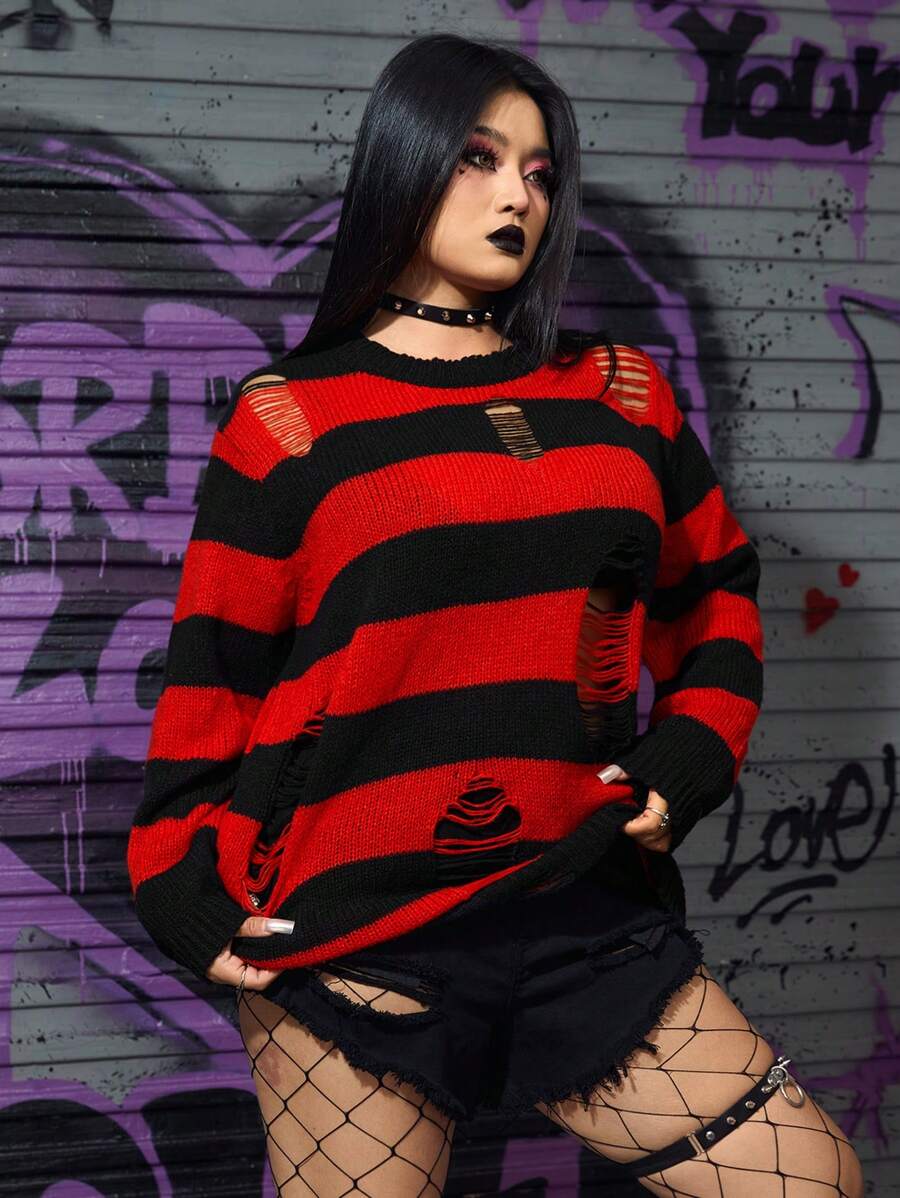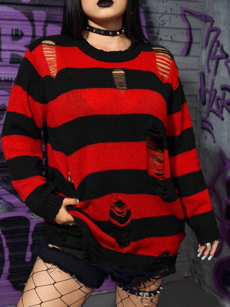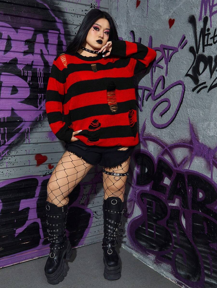 Grunge Punk Women's Plus Size Striped Contrast Color Distressed Sweater With Design