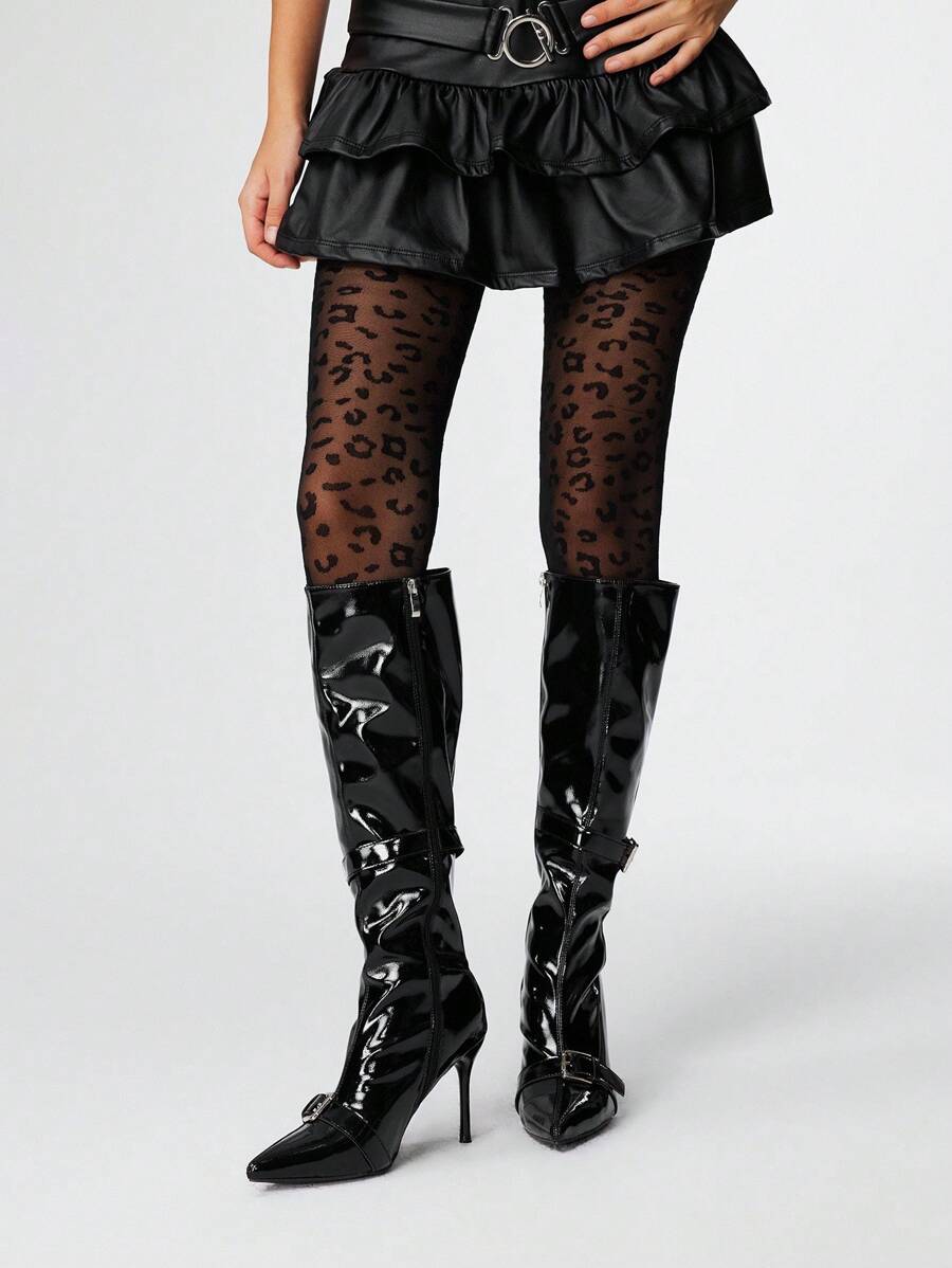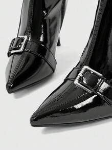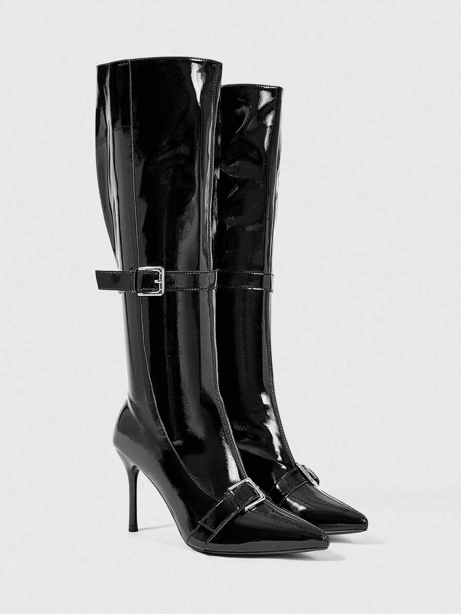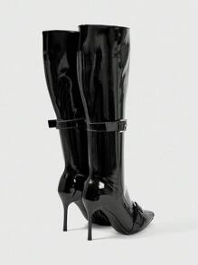 Grunge Punk Women's Pointed Toe High Heel Strap Decor Black PU Glossy Material Fashion Comfortable Daily Party Nightclub Side Zipper Boots