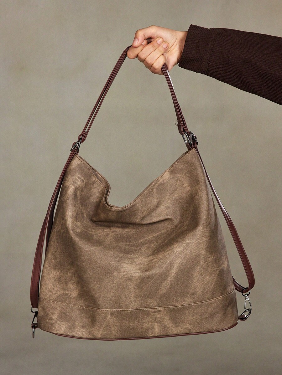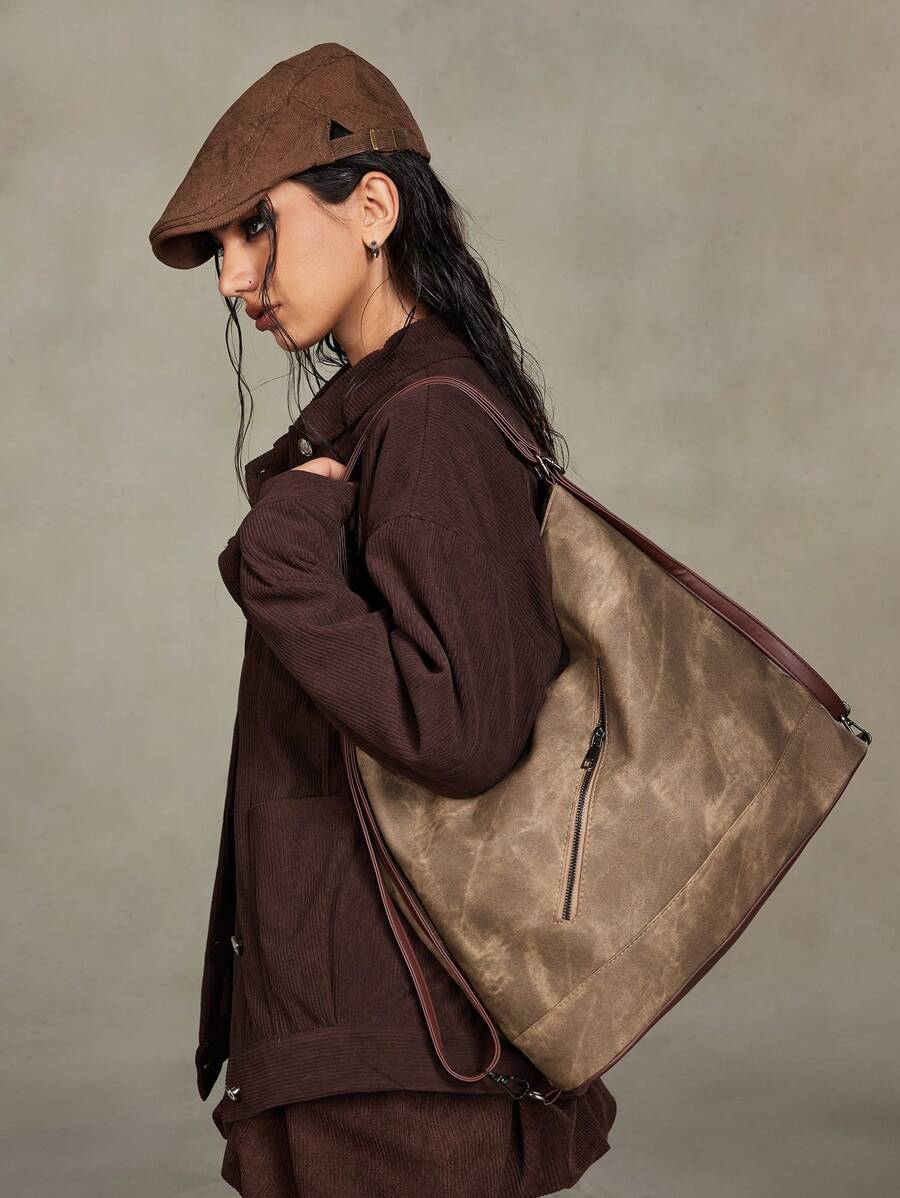 Grunge Punk Women's Retro Distressed Gradient Color Denim Effect Zipper Shoulder Tote Bag, Large Capacity Multifunctional Shoulder Bag Can Be Worn As Backpack