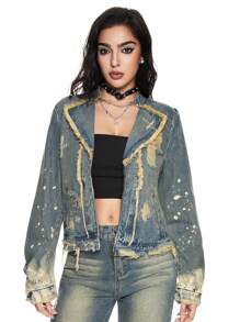 Grunge Punk Women's Retro Ripped Fringe Denim Jacket, Fashionable For Autumn