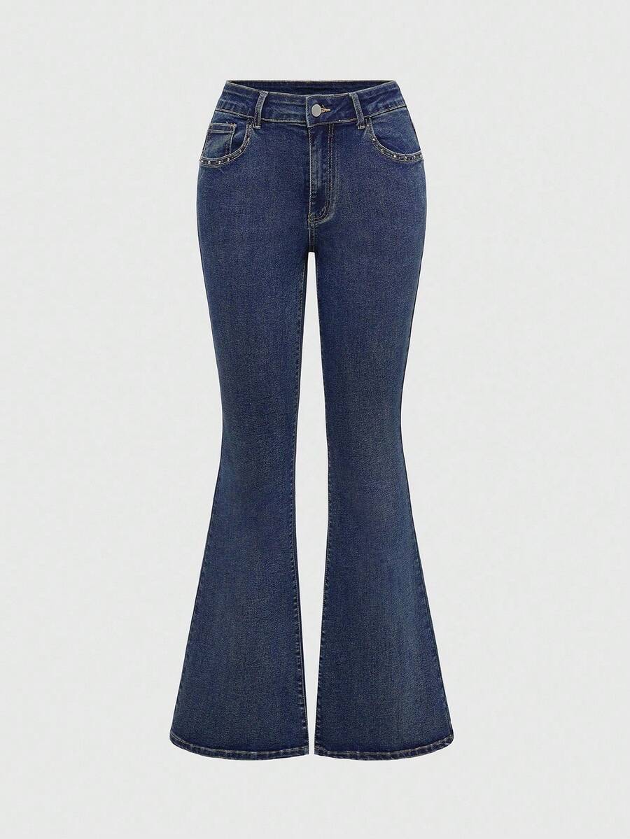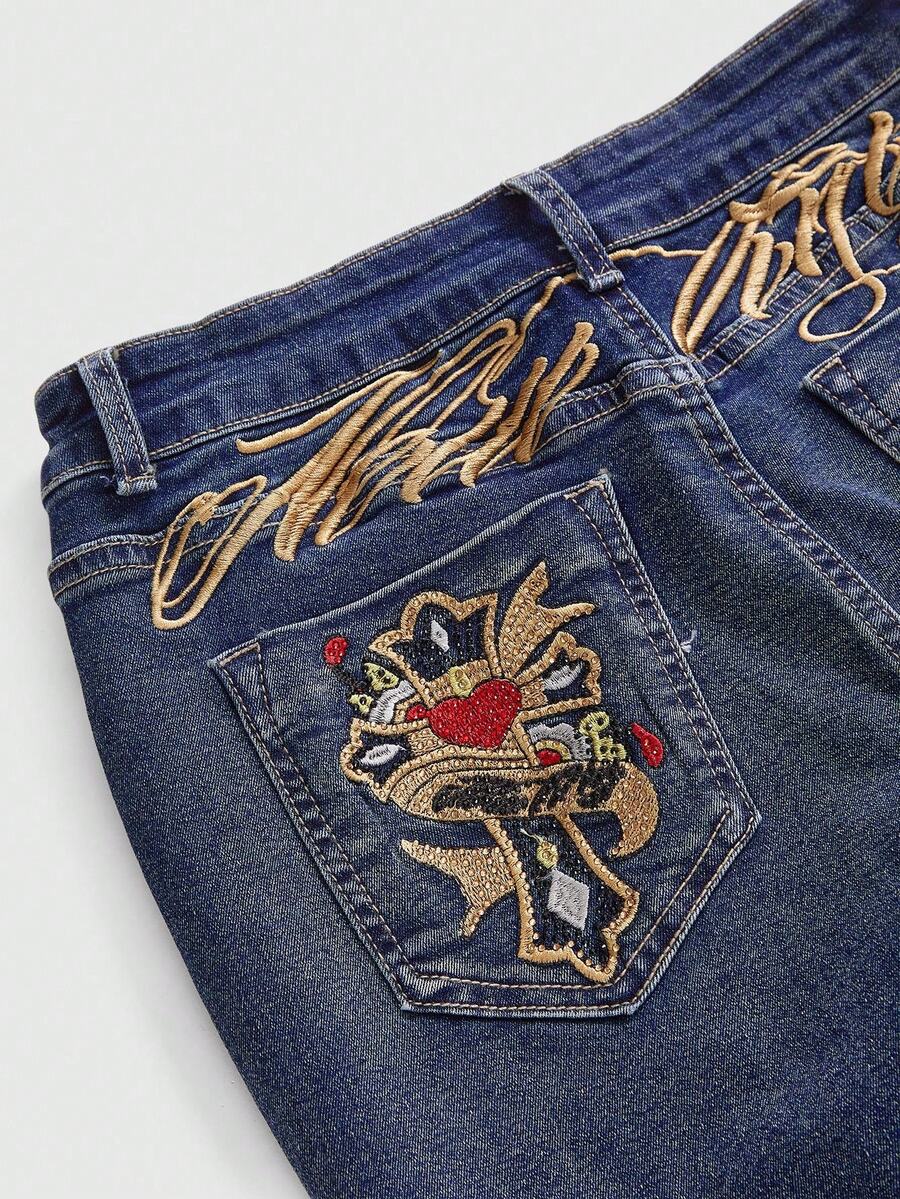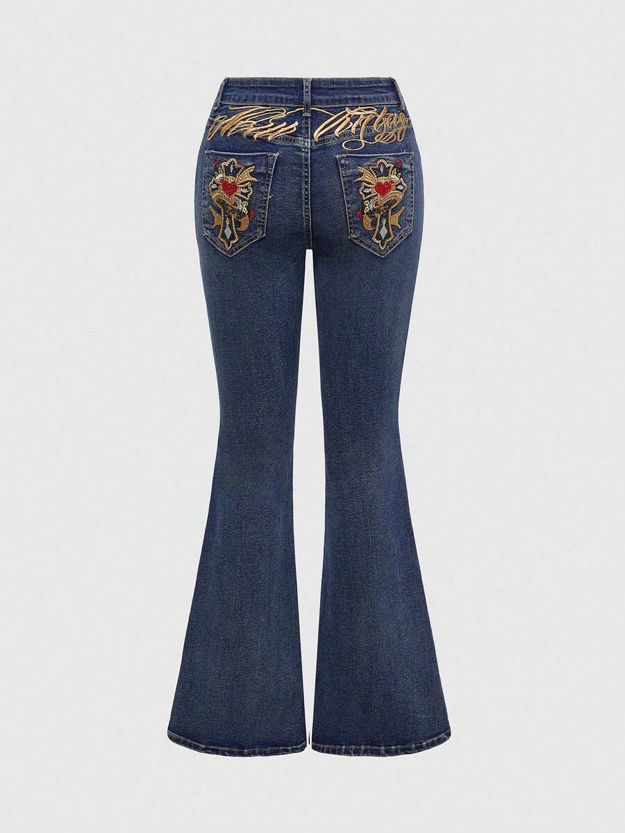 Grunge Punk Women's Retro Y2K Sexy Low-Waist Letter Embroidered Heart Cross Rhinestone Embellished Flare Jeans