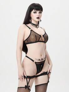 Grunge Punk Women's Sexy Punk PU Mesh Patchwork Zipper Wireless Sheer Lingerie Set
