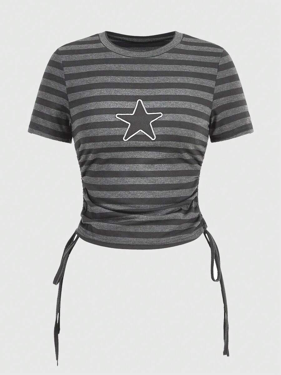Grunge Punk Women's Side Drawstring Striped Print Star Embroidery Skinny Round Neck T-Shirt, School