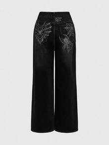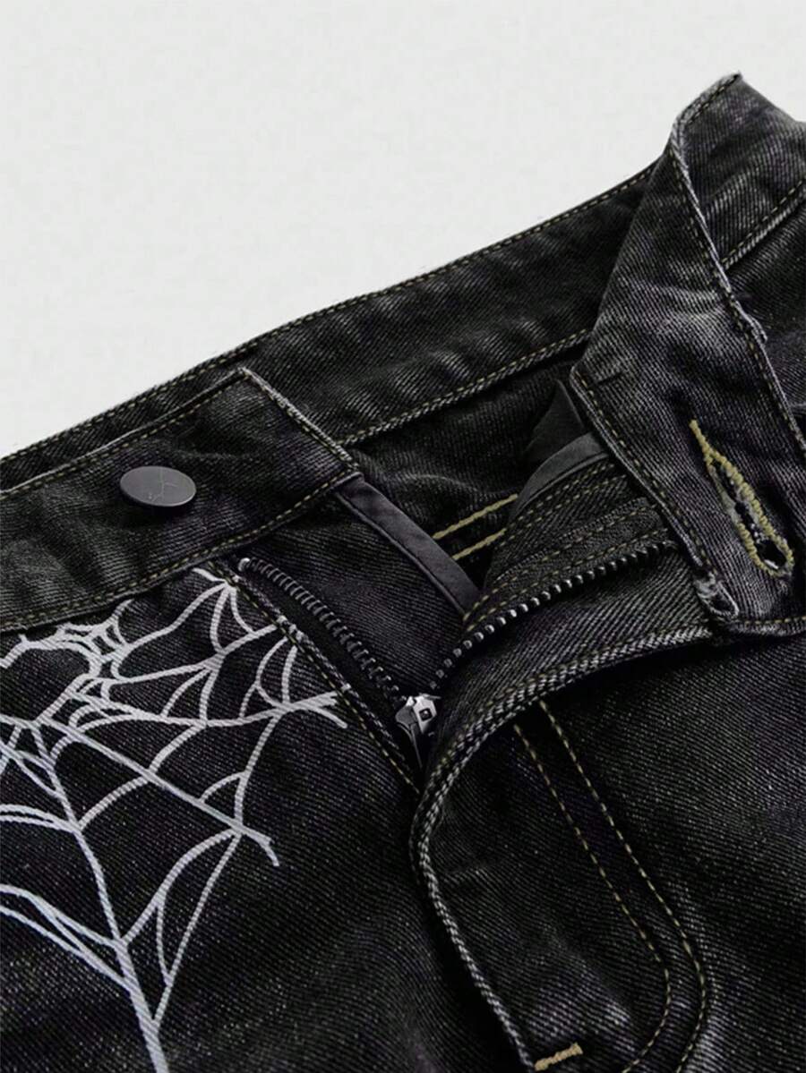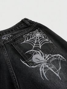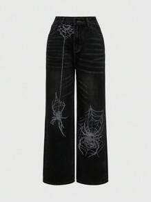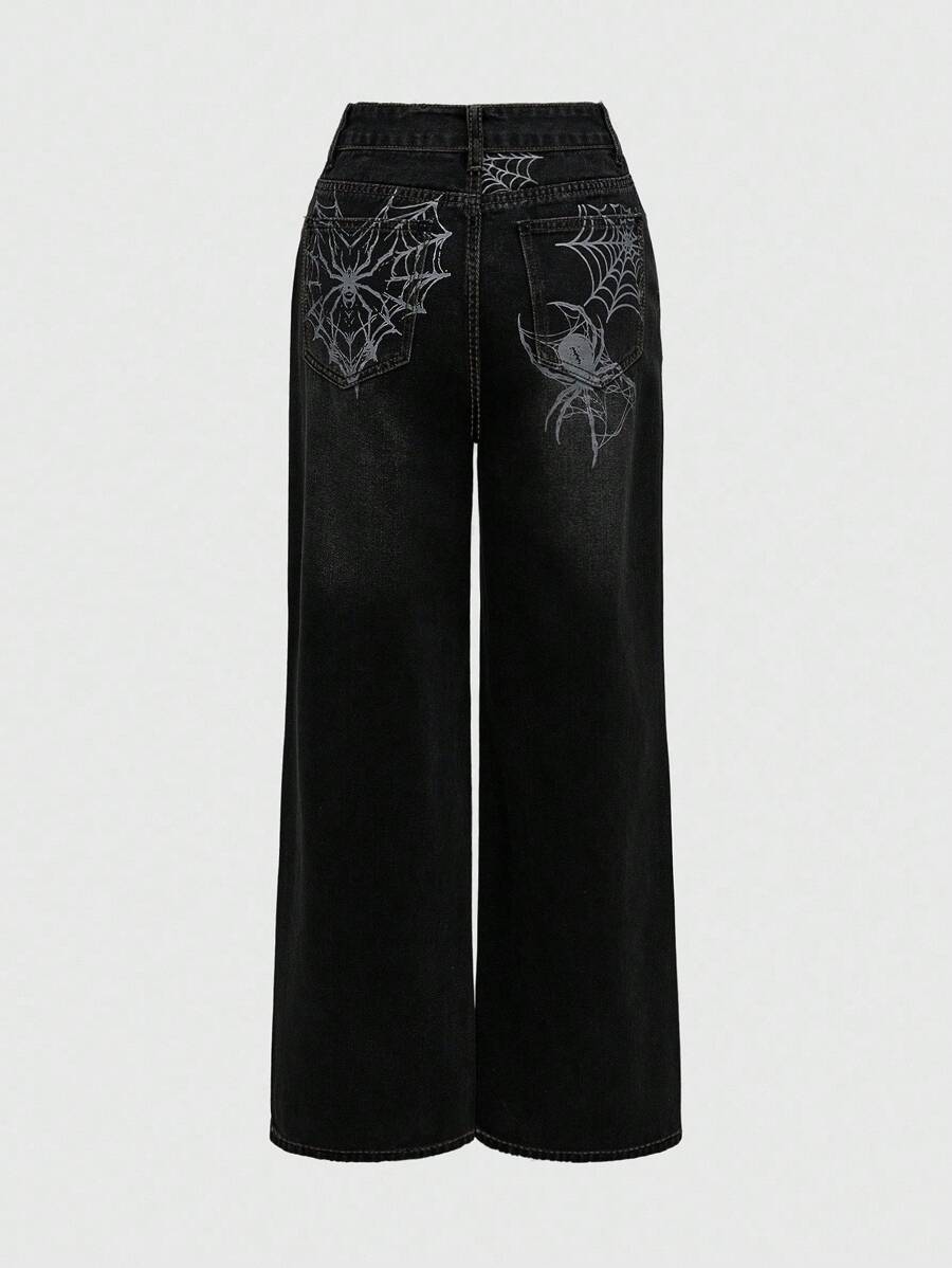 Grunge Punk Women's Spider Pattern Pocket Wide Leg Loose Casual Low Waist Jeans