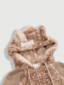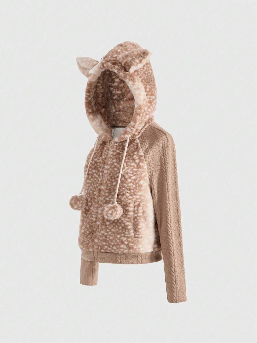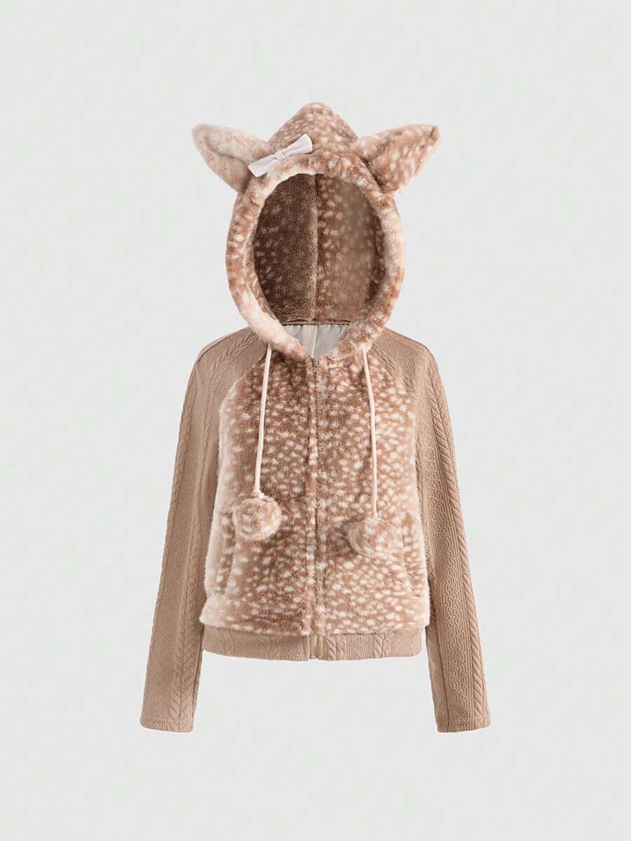 Grunge Punk Y2K Autumn/Winter Cute Deer Pattern Faux Fur Patchwork Jacquard Knit Cardigan With 3D Ear Decor For Women