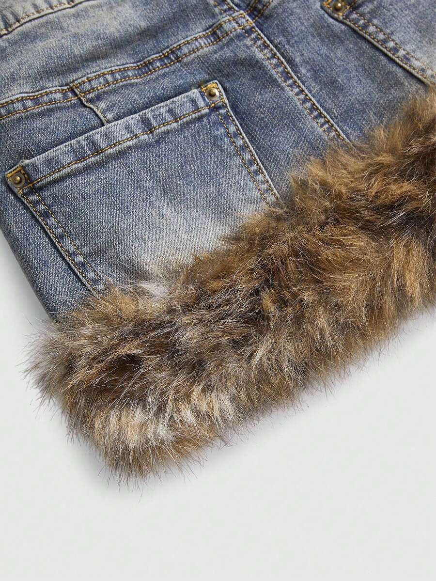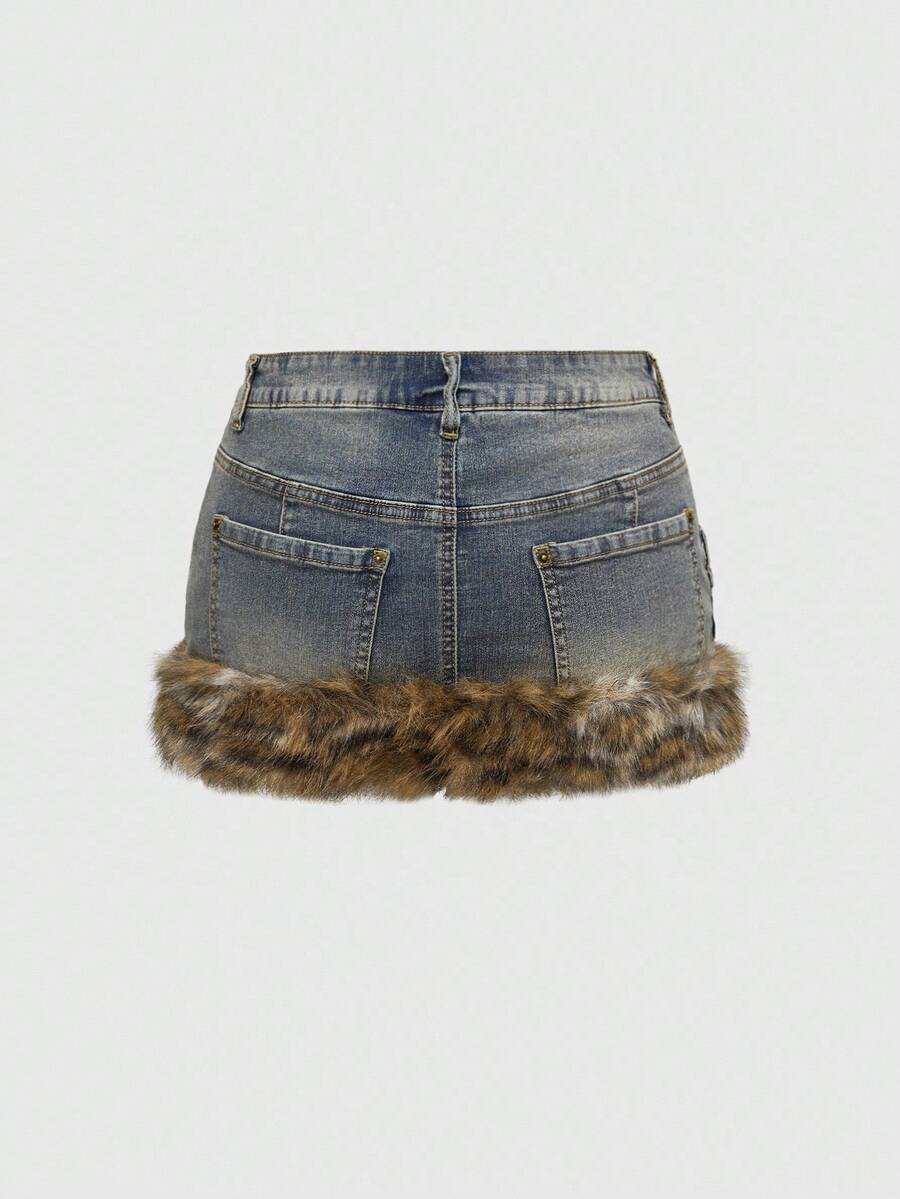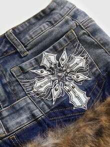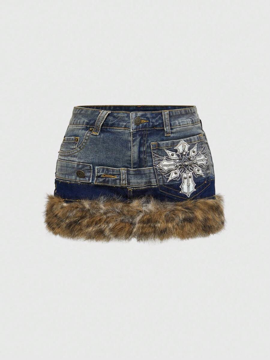 Grunge Punk Y2K Baddie Cross Wing Embroidery Multi-Layer Waistband Design Leopard Print Frayed Hem Super Low-Rise Mini Denim Skirt