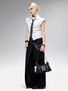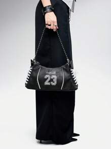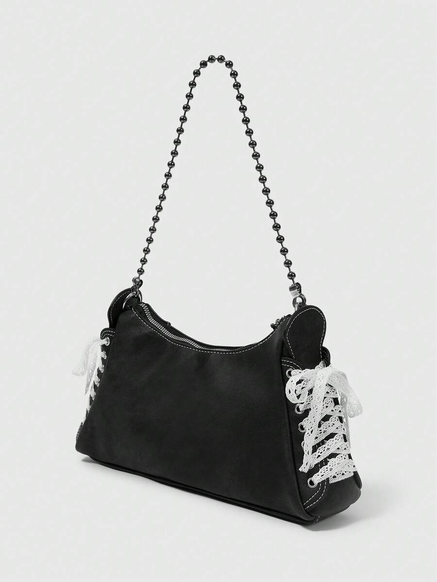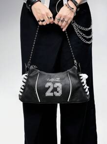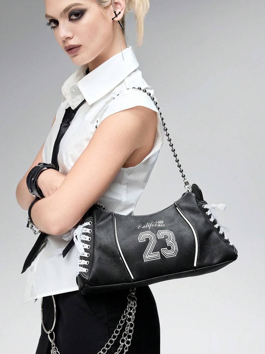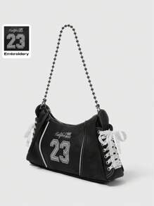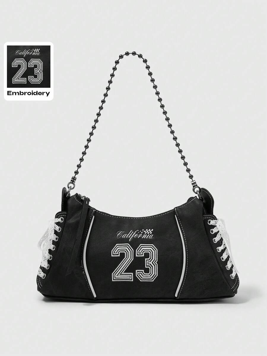Grunge Punk Y2K Embroidered 23 Black Faux Denim PU Crossbody Bag With Lace Shoelace Tie Straps - Balletcore Sporty Shoulder Purse For Women, Gothic Grunge Daily Streetwear Shopping For Back To School Teen Girls