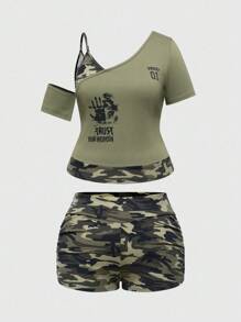 Grunge Punk Y2K Grunge Retro Eye & Letter Print Camo Patchwork Cropped Top And Shorts Set, Plus Size