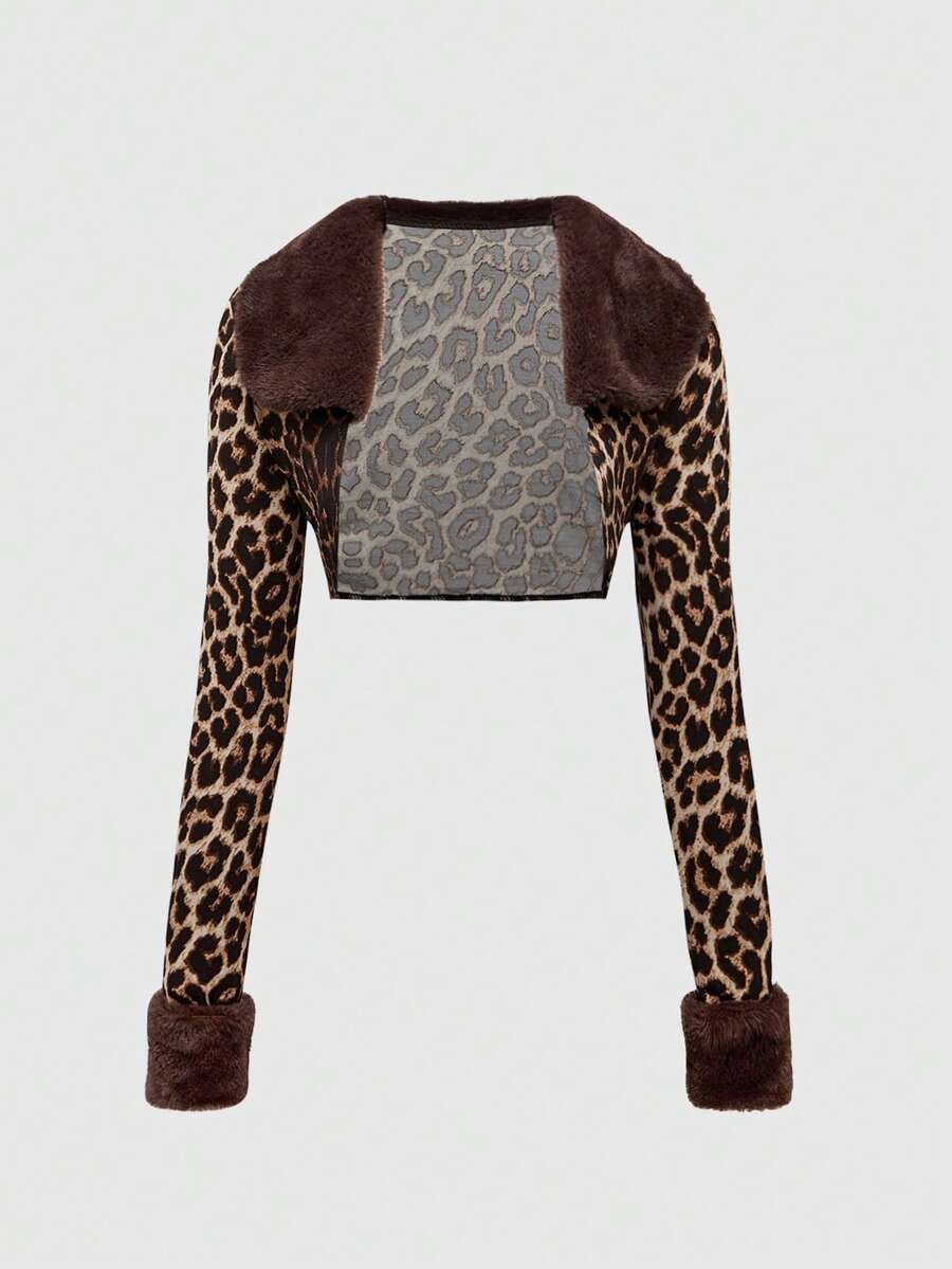 Grunge Punk Y2K Gyaru Sexy Leopard Print Patchwork Fluffy Collar Crop Top For Women