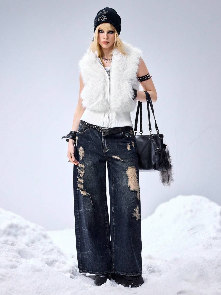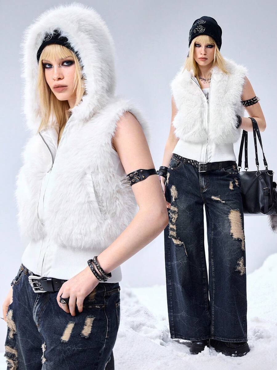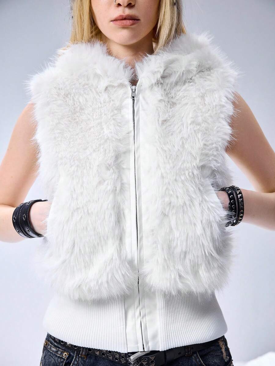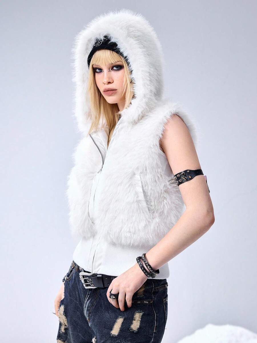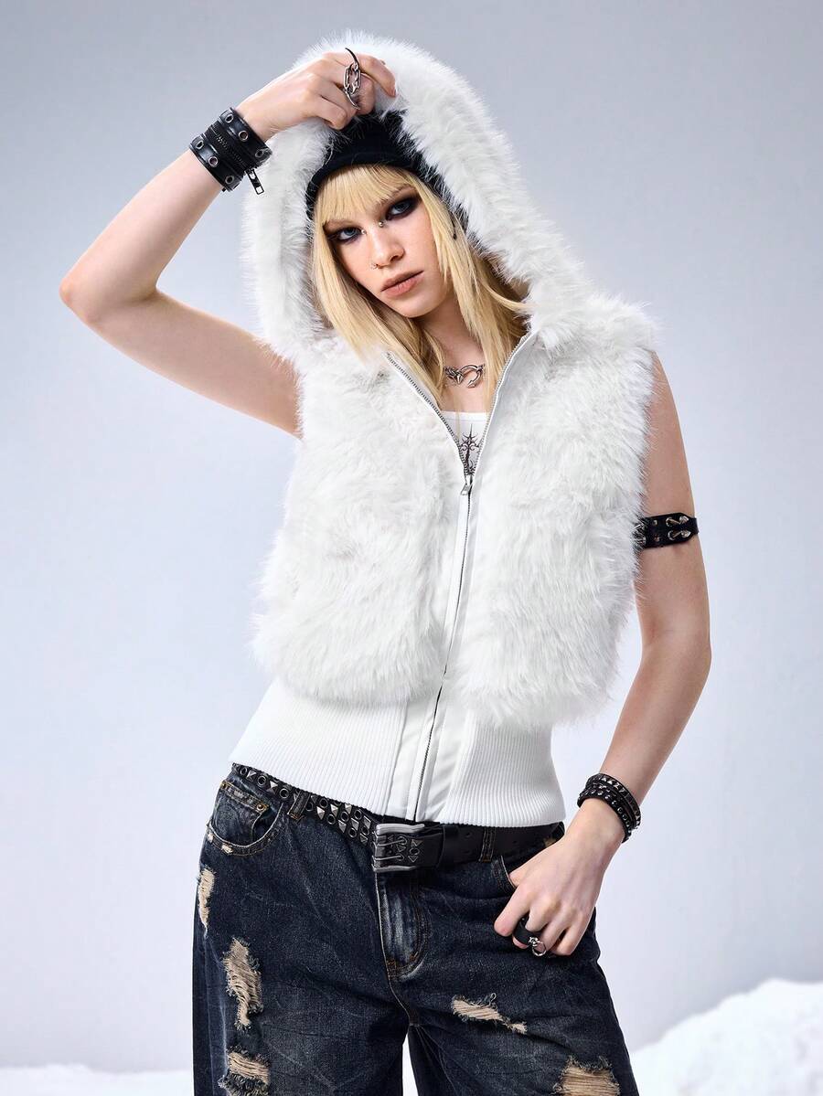 Grunge Punk Y2K Kpop Faux Fur Hooded Cardigan Vest Jacket For Women