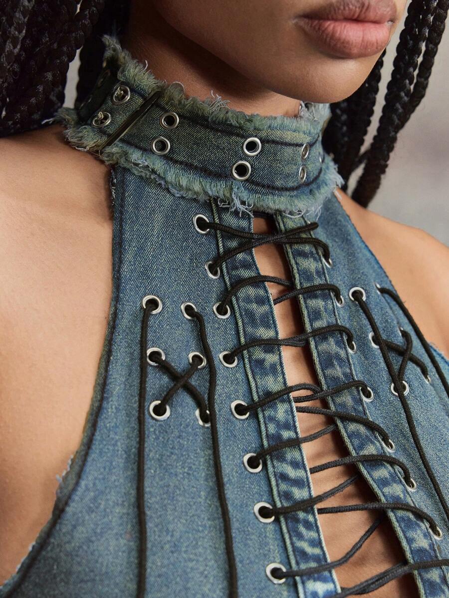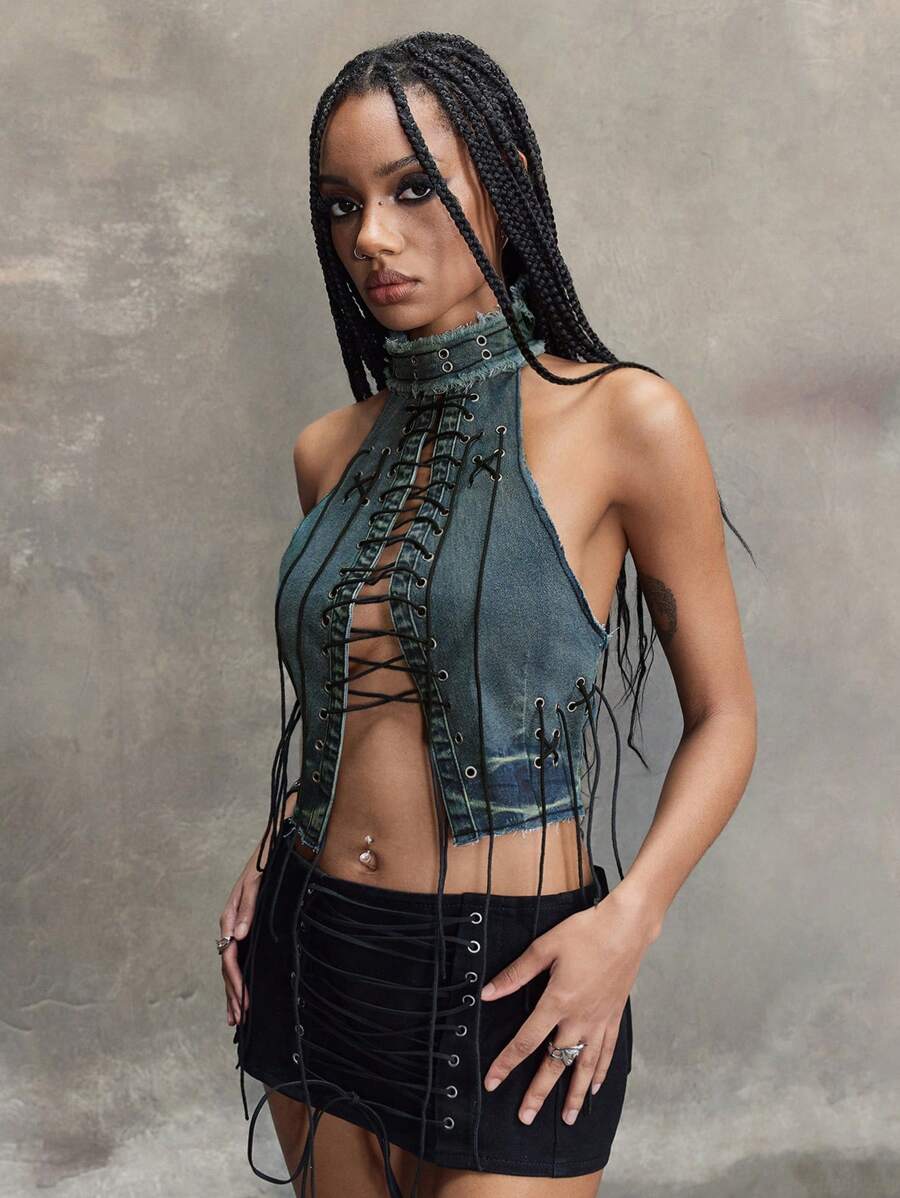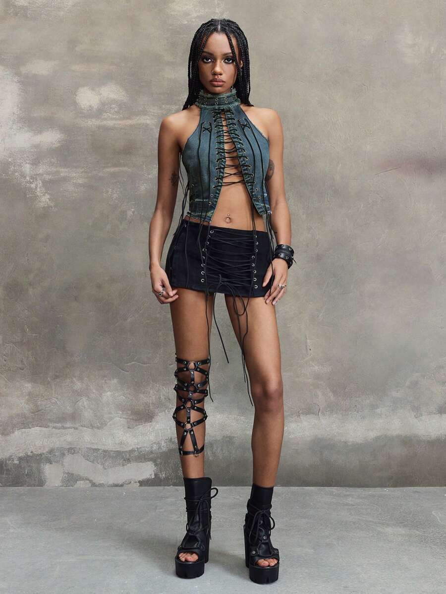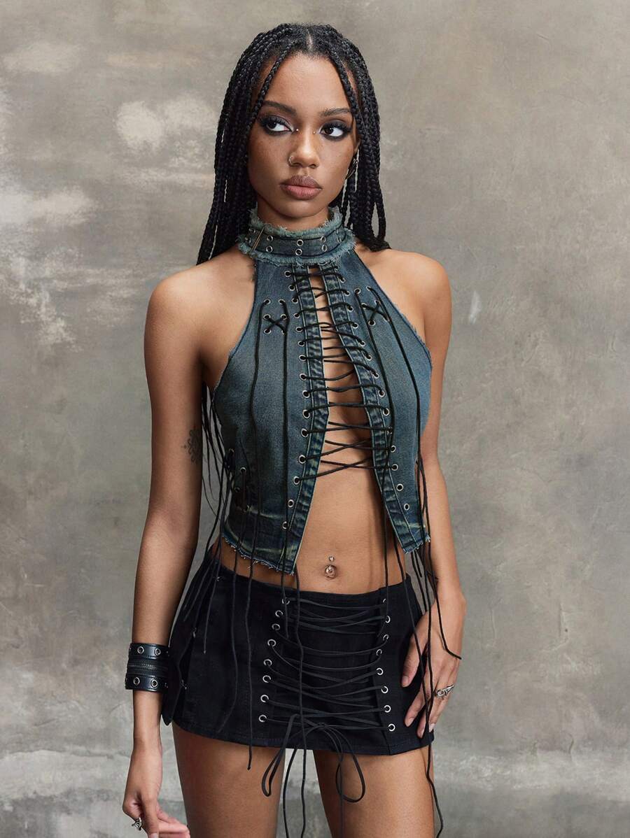 Grunge Punk Y2K Punk Rock Music Festival, Front Tie-Up Design Denim Sleeveless Stand Collar Top