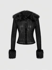 Grunge Punk Y2K Retro Cropped Faux Fur Collar Elastic Fitted Cardigan For Women