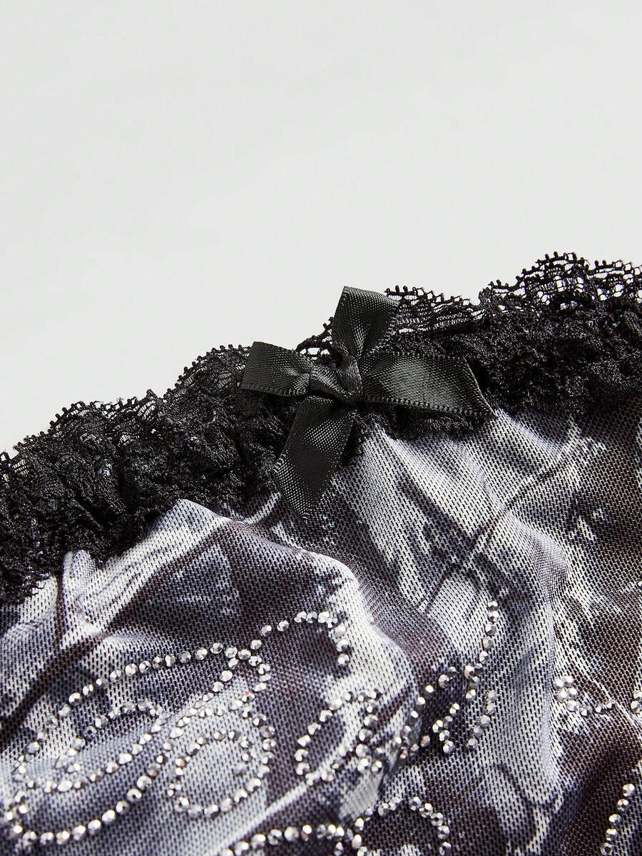 Grunge Punk Y2K Retro Hip Hop Baddie Camouflage Mesh Rhinestones Drawstring Crop Top For Women