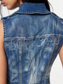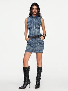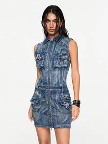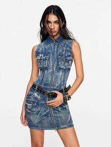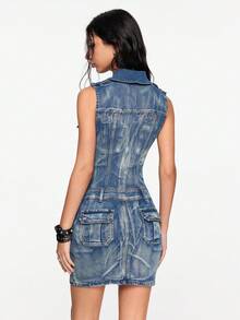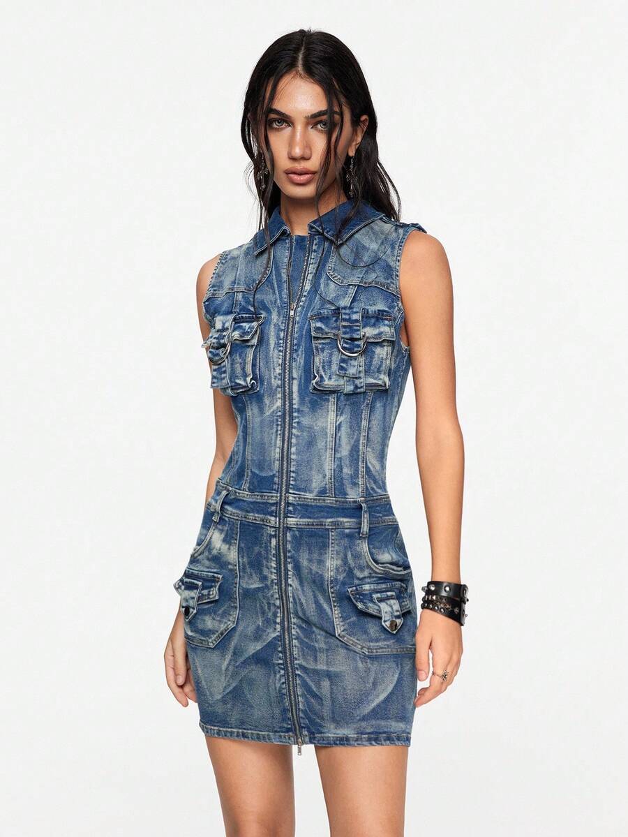 Grunge Punk Y2K Retro Washed Denim Cropped Fitted Low Waist Mini Dress For Women