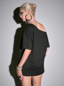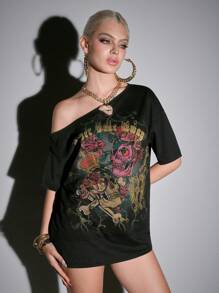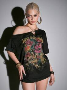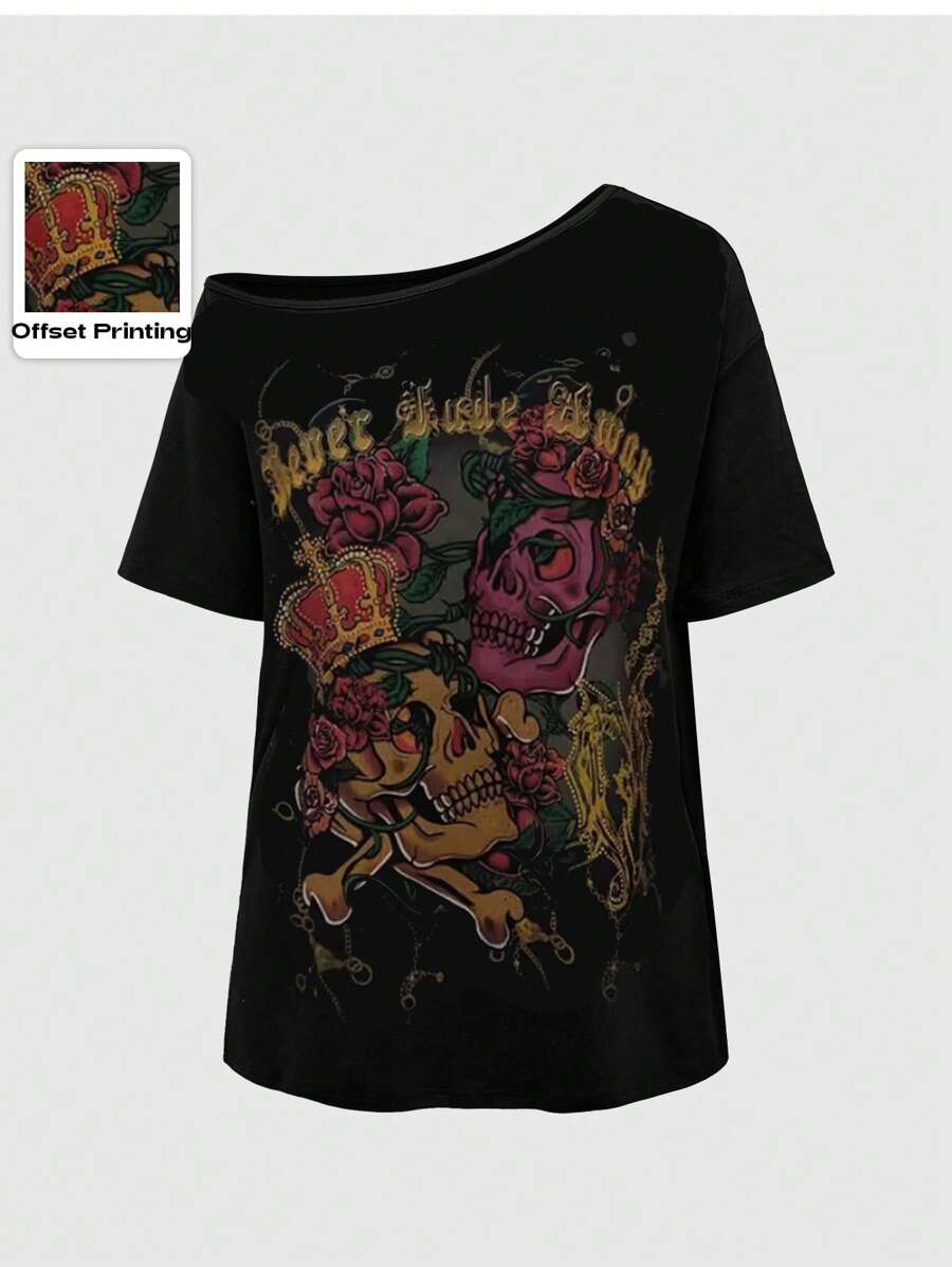 Grunge Punk Y2K Shibuya Skull Crown & Vine Chain Decor Asymmetrical Neck Women T-Shirt