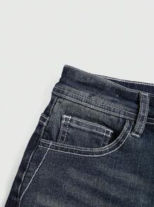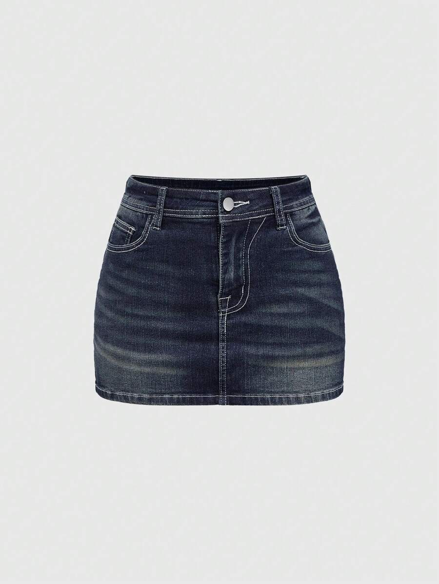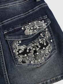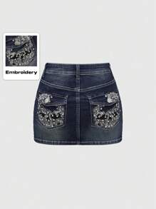 Grunge Punk Y2K Style Distressed Denim Skirt With Skeleton Embroidery & Studs, Color Block Stitching, Elastic Waist Mini Skirt Set With Leggings, For Women