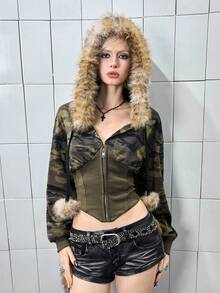 Grunge Punk Y2K Subculture Retro Fitted Camouflage Fur Collar Hooded Sweatshirt For Women