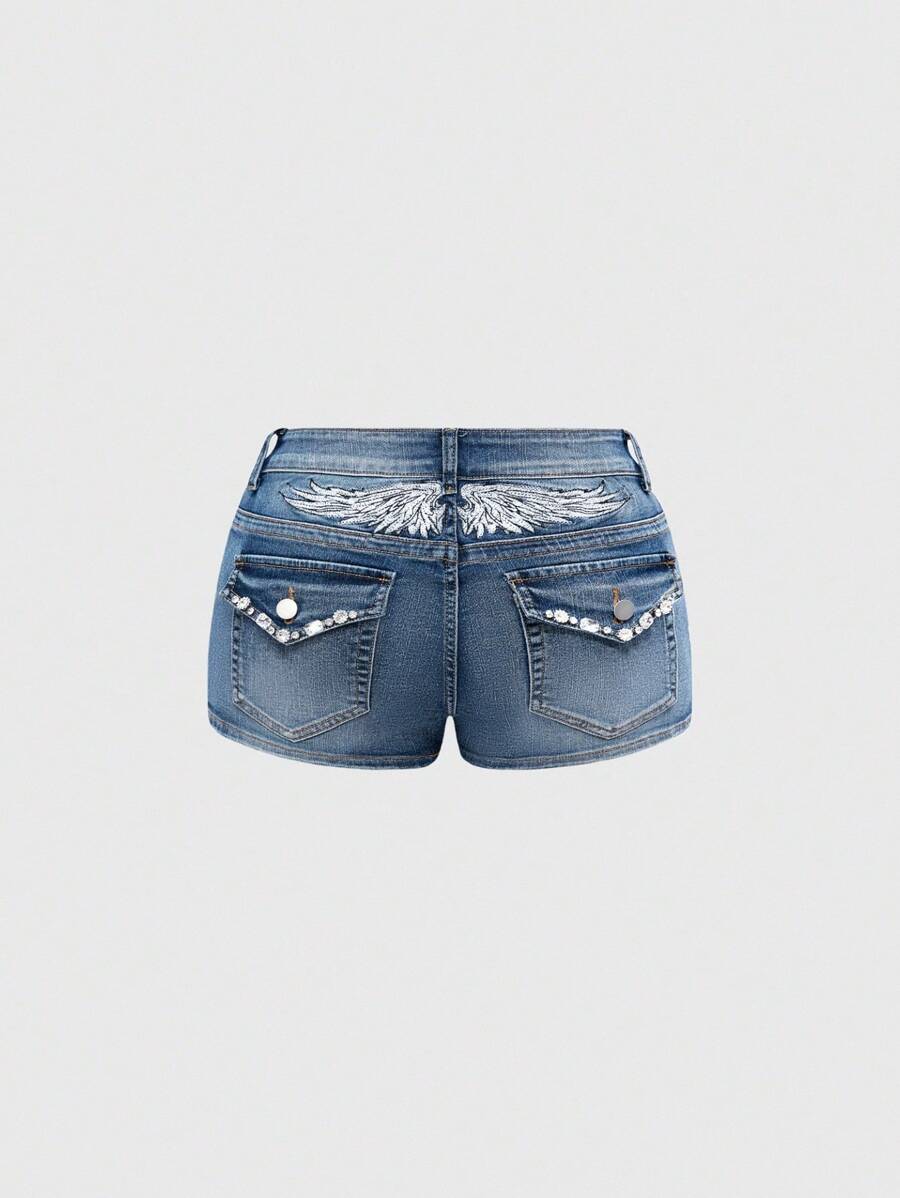 Grunge Punk Y2K Ultra Low Waist Midriff-Baring Sexy Backless Wing Embroidery & Rhinestone Decor Super Short Denim Shorts