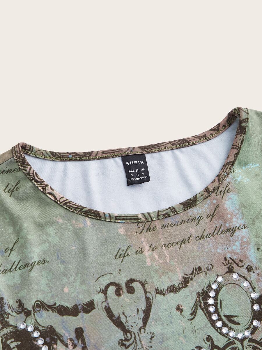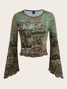 Grunge Slogan Graphic Bell Sleeve Lettuce Trim Tee