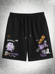 Goth Guys Alien & Letter Graphic Drawstring Waist Shorts
