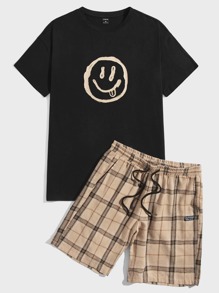 Guys Cartoon Graphic Tee & Plaid Shorts Set