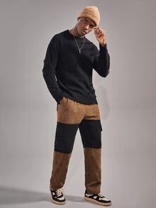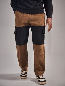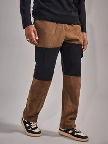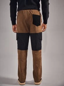 Guys Color-block Drawstring Waist Flap Pocket Corduroy Pants